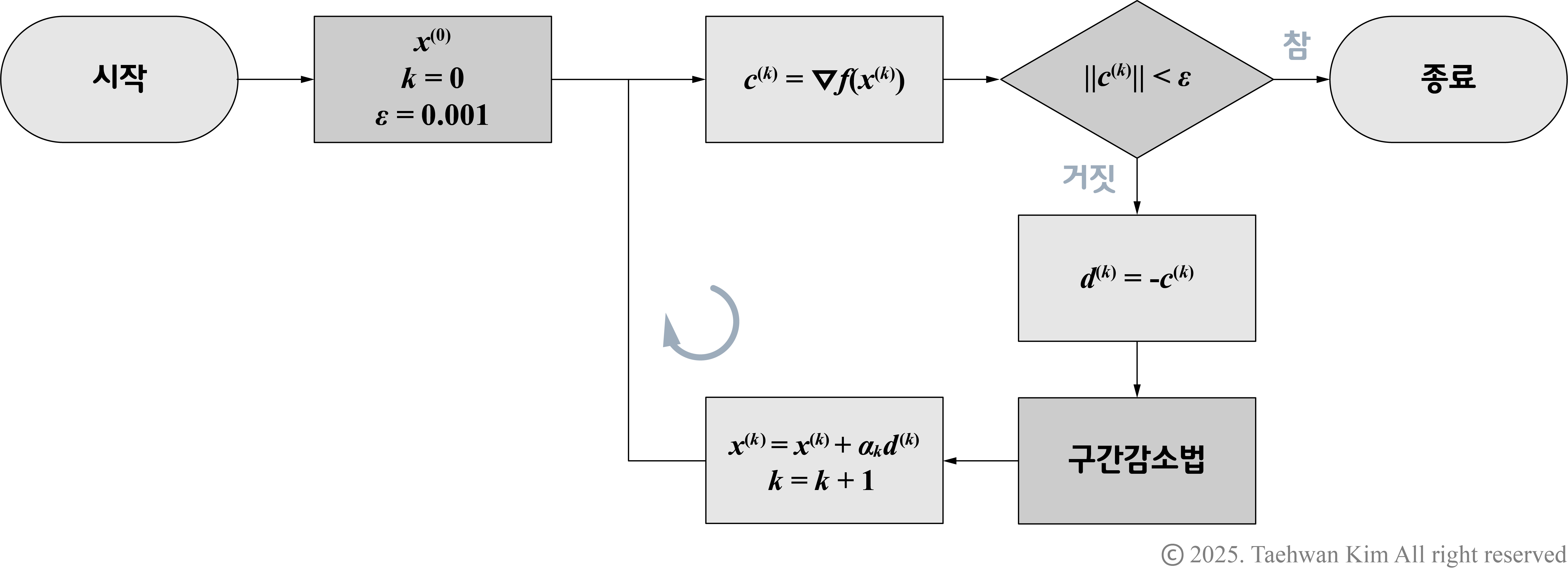 $$ \begin{align} \textbf{c}^{\left(k\right)} \cdot \textbf{d}^{\left(k\right)} = -\left\| \textbf{c}^{\left(k\right)} \right\| < 0 \end{align}$$3. 이동거리 결정