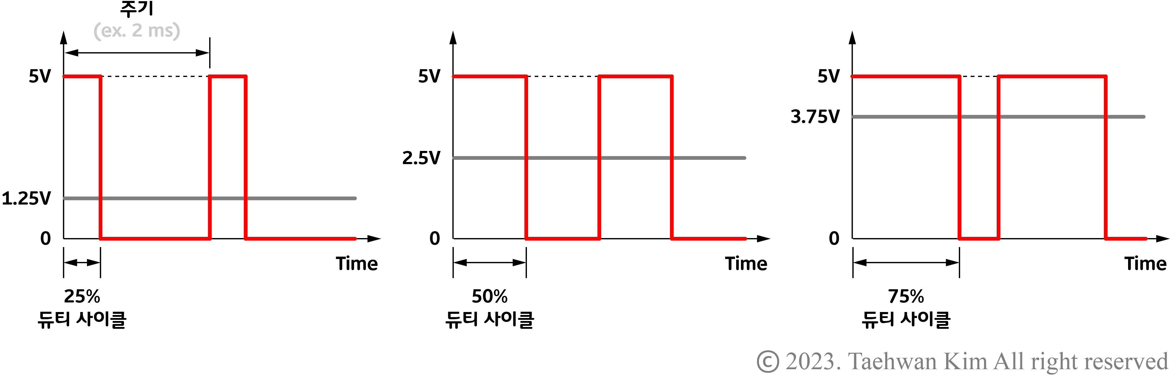 펄스 폭 변조 PWM 신호는 디지털 신호 1과 디지털 신호 0으로 만들어지는 펄스의 폭을 적절하게 조절함으로써 아날로그 신호를 모사한다. 펄스의 한 주기에서 디지털 신호 1이 출력되는 시간의 비율인 듀티 사이클(duty cycle)로 아날로그 신호의 크기를 조절한다. 예를 들어, 듀티 사이클이 25%인 경우에는 아날로그 신호 1.25V가, 50%인 경우에는 2.5V가, 75%인 경우에는 아날로그 신호 3.75V가 출력된다.
