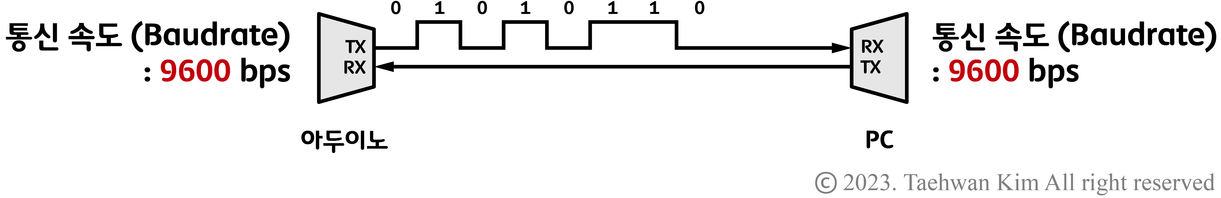 UART 통신 범용 비동기 송수신(Universal Asynchronous Receiver/Transmitter, UART) 통신은 아두이노가 PC와 데이터를 주고받을 때 사용하는 통신 방식으로, 두 기기 사이에 연결된 송신선과 수신선을 통해 각자 신호를 전송한다. 이때 송신기와 수신기 사이에 별도의 동기화(syncronization) 과정 없이 신호를 일방적으로 전송하기 때문에, 일정 시간동안 서로 주고받을 신호 단위를 동일하게 맞추는 것이 중요하다. 만약 각 기기의 통신 속도가 동일하지 않으면 신호를 받는 중간에 중단하거나, 신호를 계속 받아들여 다른 단위의 신호를 포함하는 등 신호 처리가 올바르게 수행되지 못한다. 따라서 UART 통신을 사용할 경우 송신기와 수신기의 통신 속도, 즉 일정 시간에 몇 비트의 신호가 들어오는지 동일하게 설정하는 것이 중요하다.