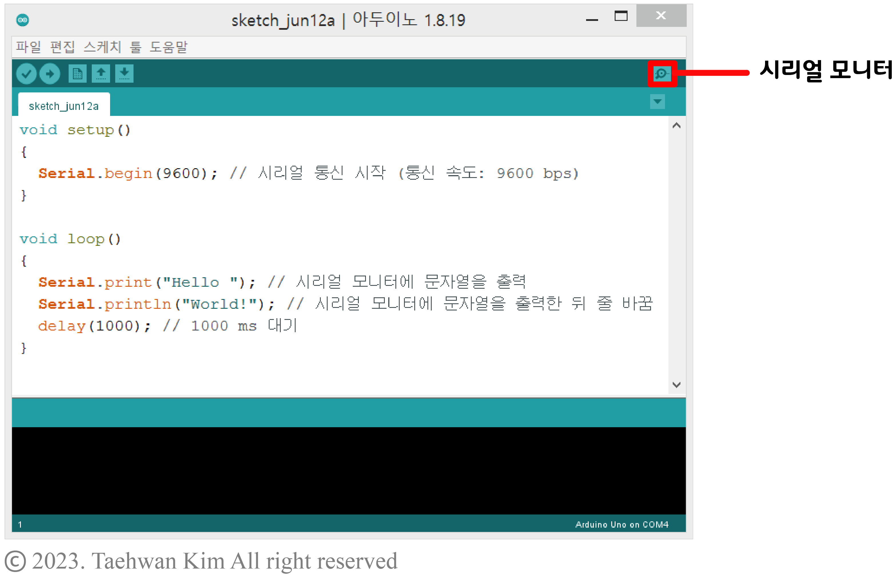 void setup() { Serial.begin(9600); // 시리얼 통신 시작 (통신 속도: 9600 bps) } void loop() { Serial.print("Hello "); // 시리얼 모니터에 문자열을 출력 Serial.println("World!"); // 시리얼 모니터에 문자열을 출력한 뒤 줄 바꿈 delay(1000); // 1000 ms 대기 }4.3. 시리얼 모니터