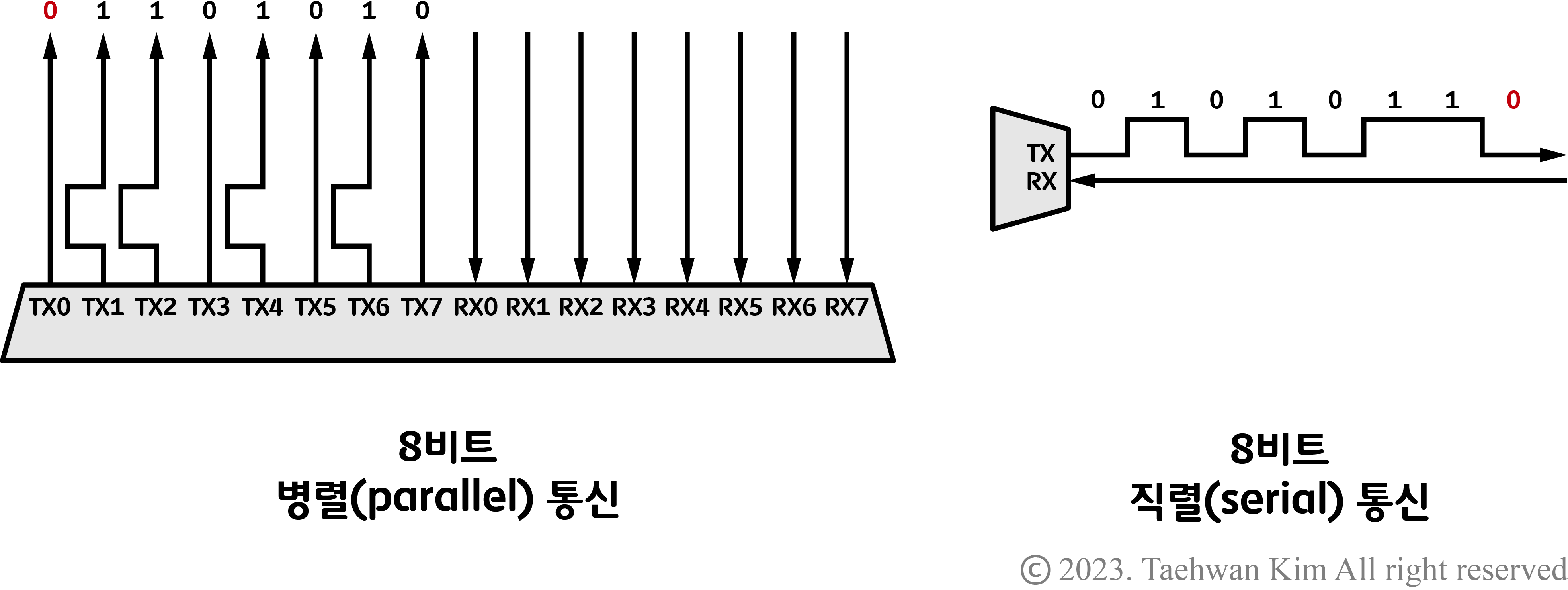 8비트 병렬 통신과 8비트 직렬 통신 서로 다른 두 기기가 데이터를 주고받는 통신 방식은 크게 병렬(parallel) 통신과 직렬(serial) 통신으로 나눌 수 있다. 병렬 통신은 여러 가닥의 선을 통해 동시에 데이터를 주고 받는 반면, 직렬 통신은 송신선(TX)과 수신선(RX) 두 가닥을 통해 일렬로 데이터를 주고 받는다. 병렬 통신이 직렬 통신에 비해 빠르다는 장점이 있지만, 한 번에 주고 받는 데이터의 크기에 따라 통신선의 수가 늘어난다는 단점이 있다. 직렬 통신은 데이터가 연결되어 들어오기 때문에 통신 시 데이터의 크기를 잘 구분해야 하지만, 수신기와 송신기 사이의 통신 속도만 맞춰준다면 병렬 통신보다 저렴하게 이용할 수 있다. 아두이노 하드웨어가 PC 혹은 센서와 데이터를 주고받을 때에는 직렬 통신을 이용한다.