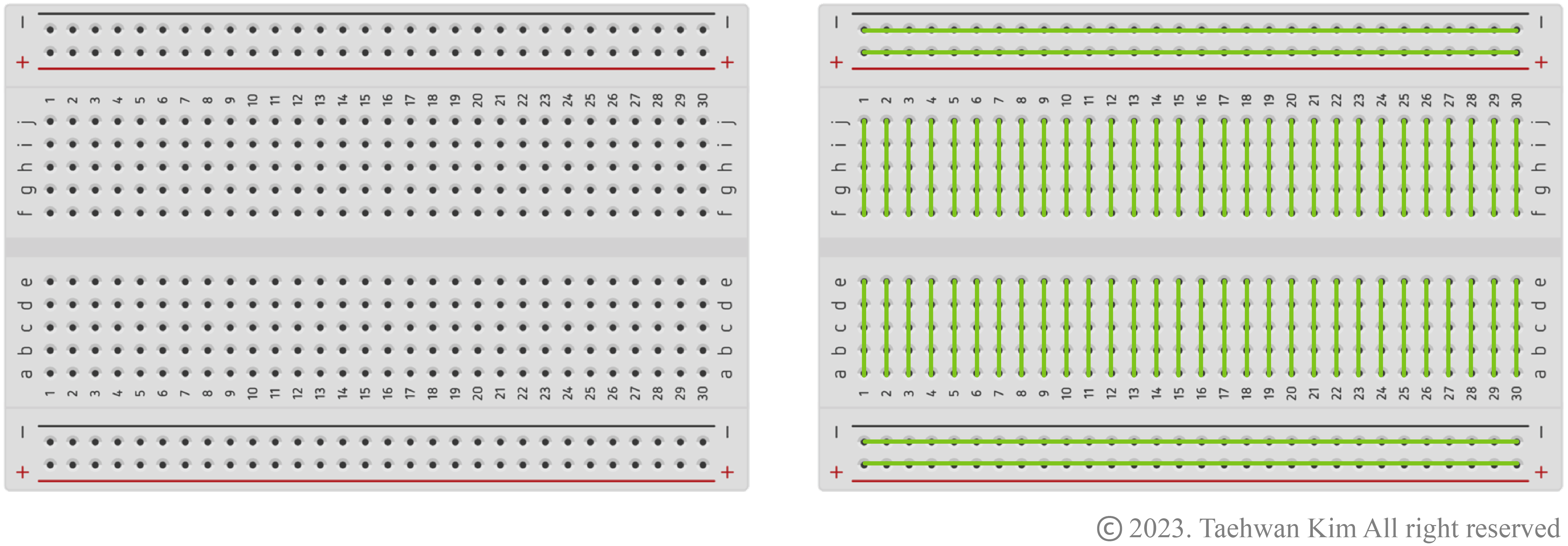 브레드보드 브레드보드(breadboard)는 전자 회로를 구성하는 데 사용하는 판이다. 인쇄 회로 기판(Printed Circuit Board, PCB)에 회로를 구성할 때에는 납땜이 필수이지만, 브레드보드는 납땜이 필요 없어 PCB를 만들기 이전에 회로를 시험해보거나 연습하기 위해 많이 사용한다. 브레드보드에는 많은 구멍이 나 있는데, 위 그림과 같이 일정 구멍끼리 내부적으로 연결되어 있어 전기가 통한다. 해당 구멍에 전자 소자를 끼워 넣고 전선을 연결하여 회로를 구성한다. 브레드보드는 아래 링크로 접속하면 구매할 수 있다.