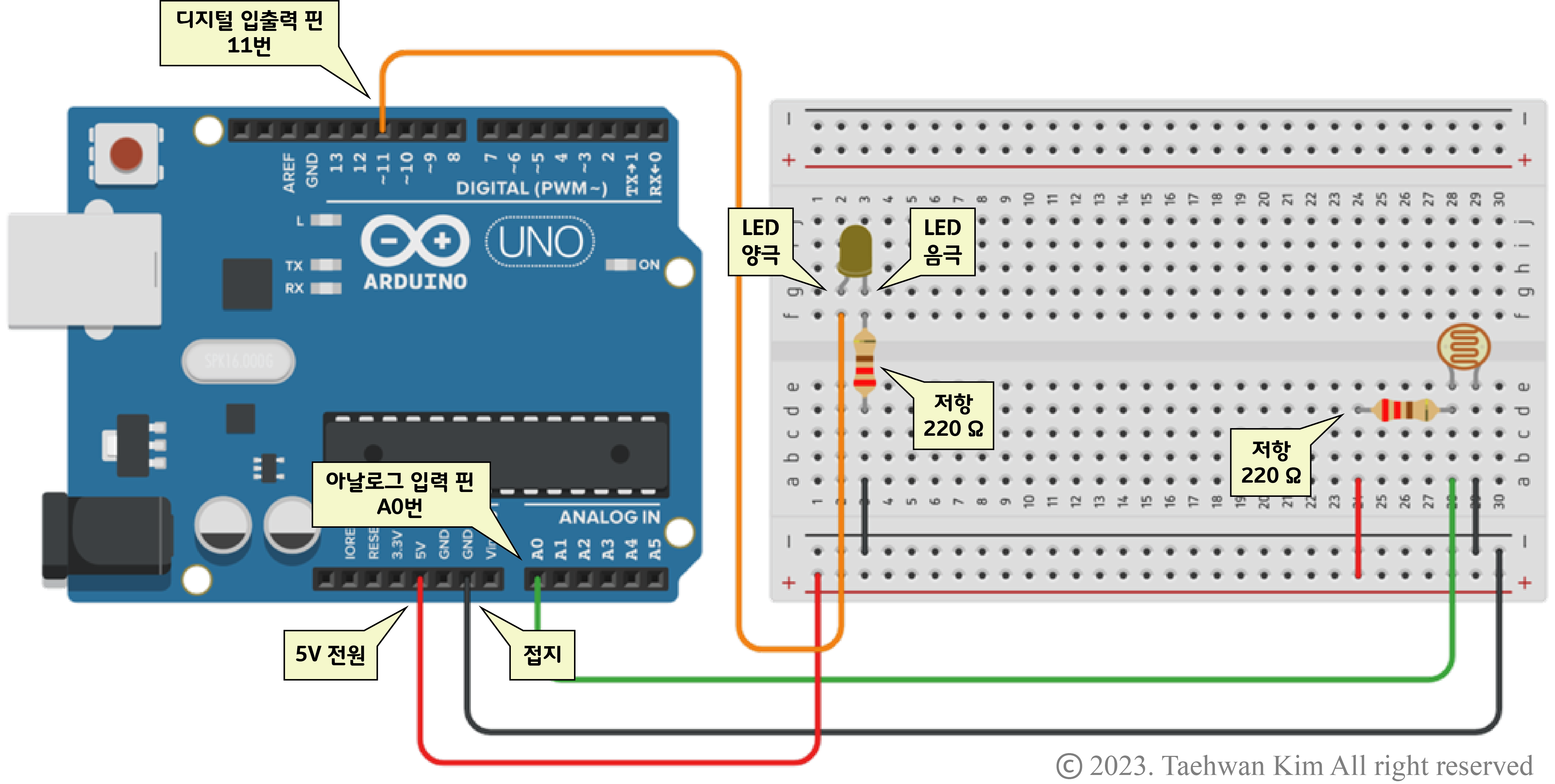int LED = 11; // 정수형 변수 선언 후 디지털 핀 번호 11로 초기화 int Light = A0; // 정수형 변수 선언 후 아날로그 핀 번호 A0로 초기화 int threshold = 875; // 정수형 변수 선언 후 875로 초기화 void setup() { pinMode(LED, OUTPUT); // 디지털 11번 핀을 출력(OUTPUT) 모드로 설정 pinMode(Light, INPUT); // 아날로그 A0번 핀을 입력(INPUT) 모드로 설정 } void loop() { if (analogRead(Light) > threshold) // 아날로그 A0번 핀에서 읽은 값이 변수에 저장된 값보다 크다면 실행 { digitalWrite(LED, HIGH); // 디지털 11번 핀에 디지털 신호 HIGH 출력 } digitalWrite(LED, LOW); // 디지털 11번 핀에 디지털 신호 LOW 출력 }[함께 읽으면 좋은 페이지]