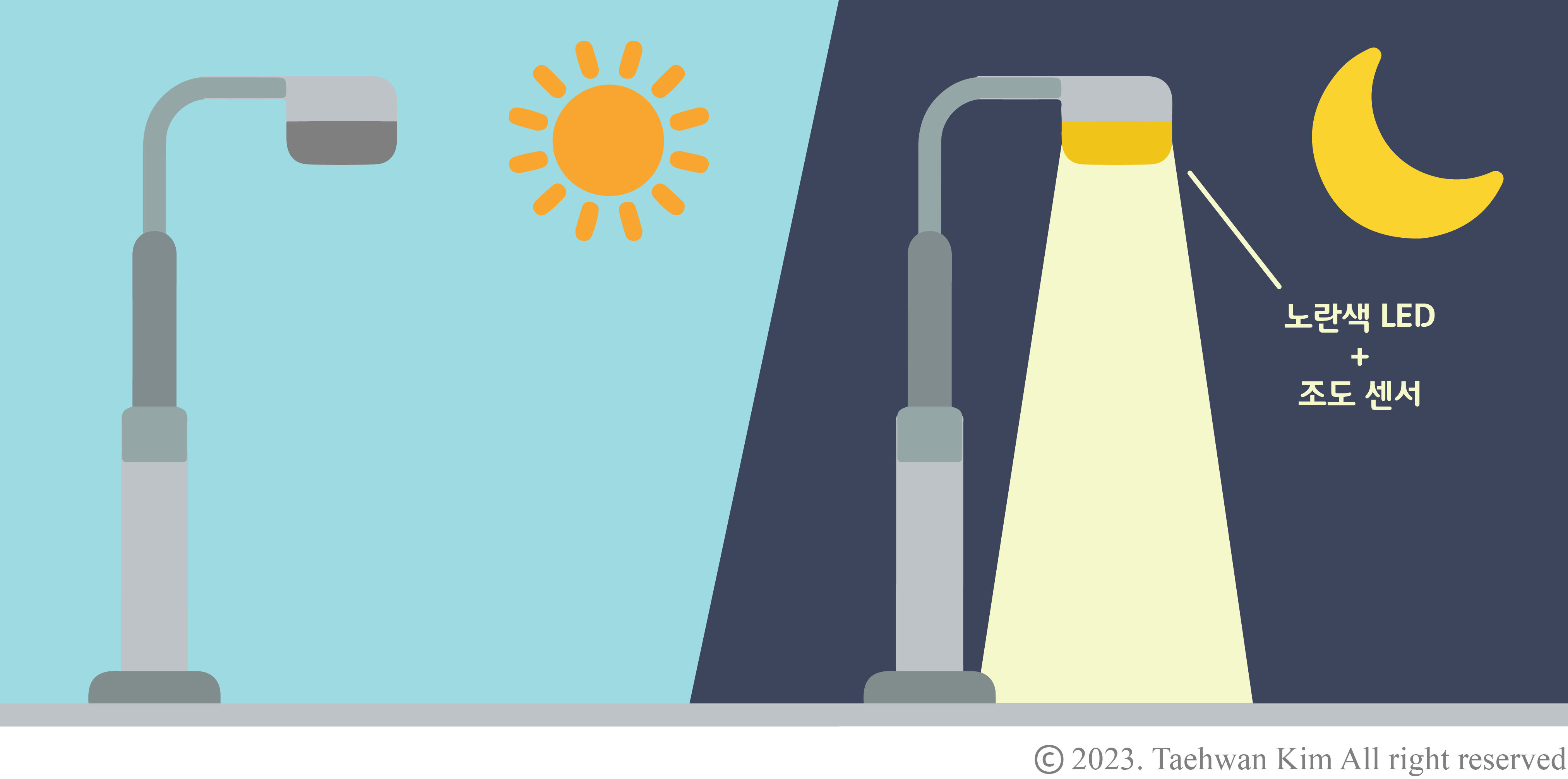 어두우면 켜지는 가로등 일상에서 쉽게 발견할 수 있는 가로등을 아두이노 플랫폼으로 구현해보자. 구현하고자 하는 가로등은 노란색 LED와 조도 센서를 포함하고 있어, 가로등은 낮에는 불이 꺼져있다가 밤이 되면 자동으로 불이 켜진다. 주위가 밝으면 LED가 꺼지고, 어두우면 LED가 켜지는 프로그램을 작성해보자.