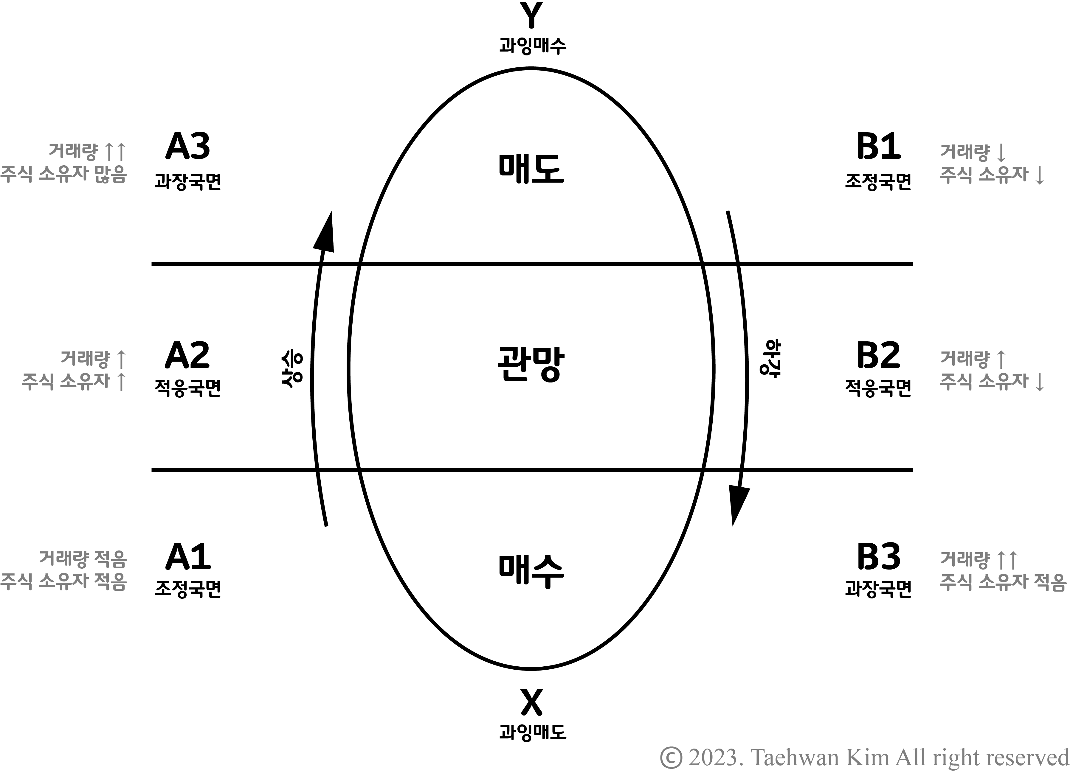 주식시장에 참여하고 있는 투자자는 하강운동의 과장국면(B3)에서 매수를 시작해야 하고, 매수하고 난 뒤에 주가가 더 떨어져도 동요하지 말야아 한다. 상승운동의 조정국면(A1)에 접어들면 이미 최저점을 넘어섰기 때문에 주식을 계속 매수해야 한다. 적응국면(A2)에서는 관망자로서 상황과 함께 움직이면 되고, 상승운동의 과장국면(A3)에 접어들면 매도할 준비를 해야한다.