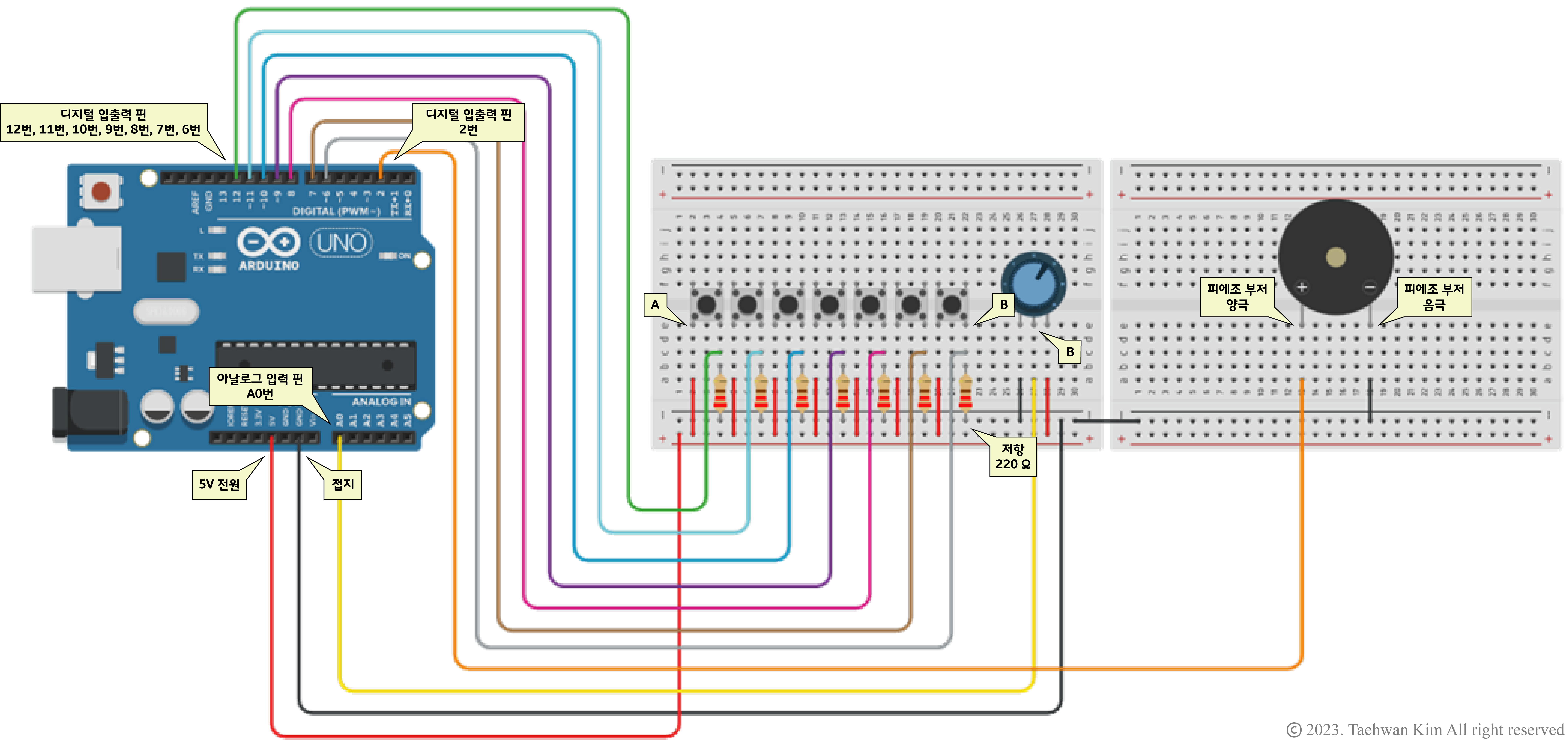 디지털 피아노 일상에서 쉽게 발견할 수 있는 디지털 피아노를 아두이노 플랫폼으로 구현해보자. 구현하고자 하는 디지털 피아노는 택트 스위치 7개와 피에조 부저, 가변저항으로 구성되어 있어, 각 스위치를 누르면 이에 해당하는 음계가 피에조 부저에서 연주된다. 또한 가변저항의 손잡이를 돌리면 옥타브를 조절할 수 있도록 프로그램을 작성해보자.