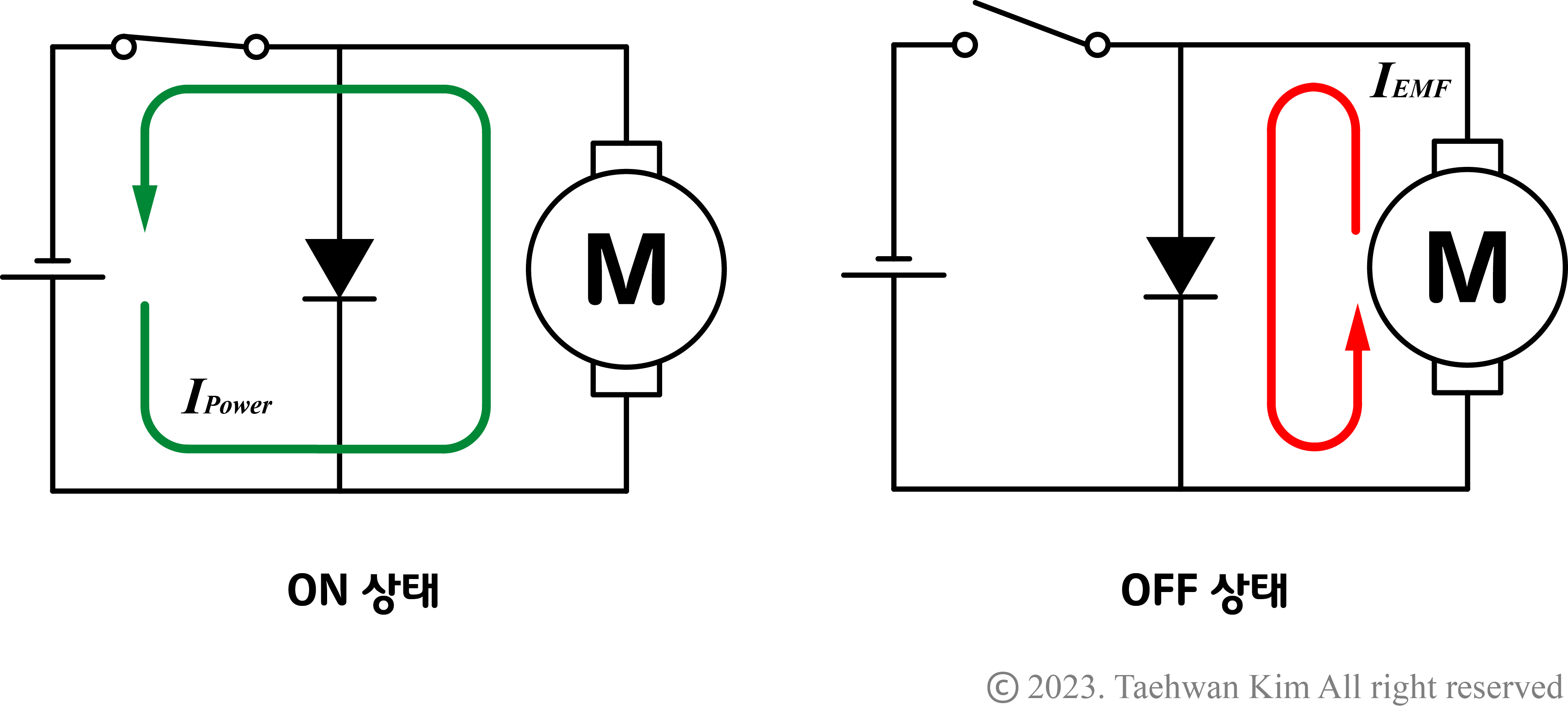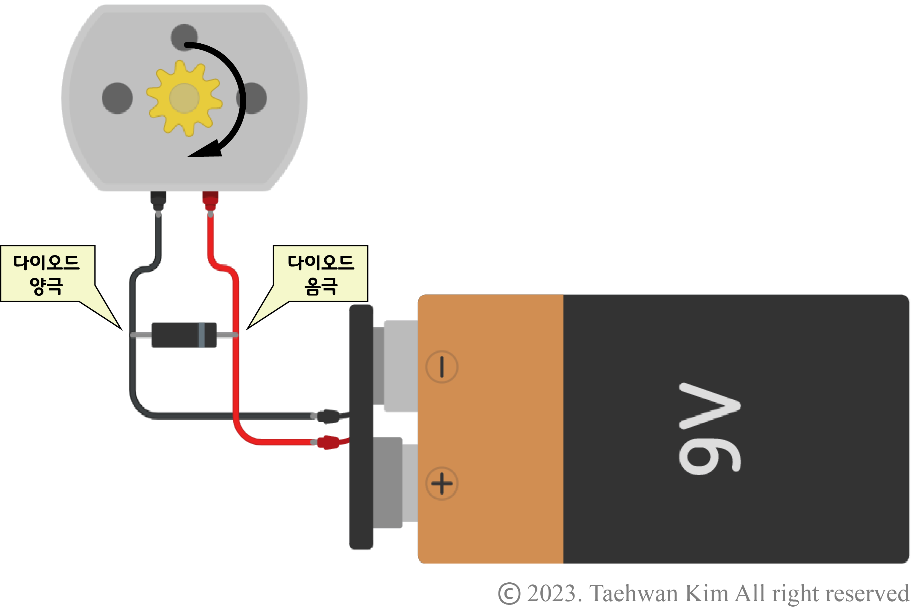 역기전력 앞서 살펴본 DC모터 그림에서 DC모터 전극 사이에 다이오드가 병렬로 연결되어 있는 것을 확인할 수 있다. 이는 DC모터에서 발생할 수 있는 역기전력(Counter-electromotive Force, Back EMF)으로부터 전자 회로를 보호하기 위한 것이다. DC모터에 전원을 공급하다가 멈추면, DC모터 내부에 있는 코일에서 유도 전류가 발생해 트랜지스터를 포함한 전자 회로에 부담을 줄 수 있다. 이를 방지하기 위해 위 그림과 같이 전류 방향과 반대 방향으로 다이오드를 배치하면 전원 공급이 멈췄을 때 발생하는 유도 전류를 소산시킬 수 있다. 다이오드는 극성이 있는 전자 소자이므로 극성의 방향을 확인하여 연결해야 한다. 하얀 선으로 표시된 부분이 음극이며, 양극에서 음극으로만 전류가 흐를 수 있다. 다이오드는 아래 링크로 접속하면 구매할 수 있다.