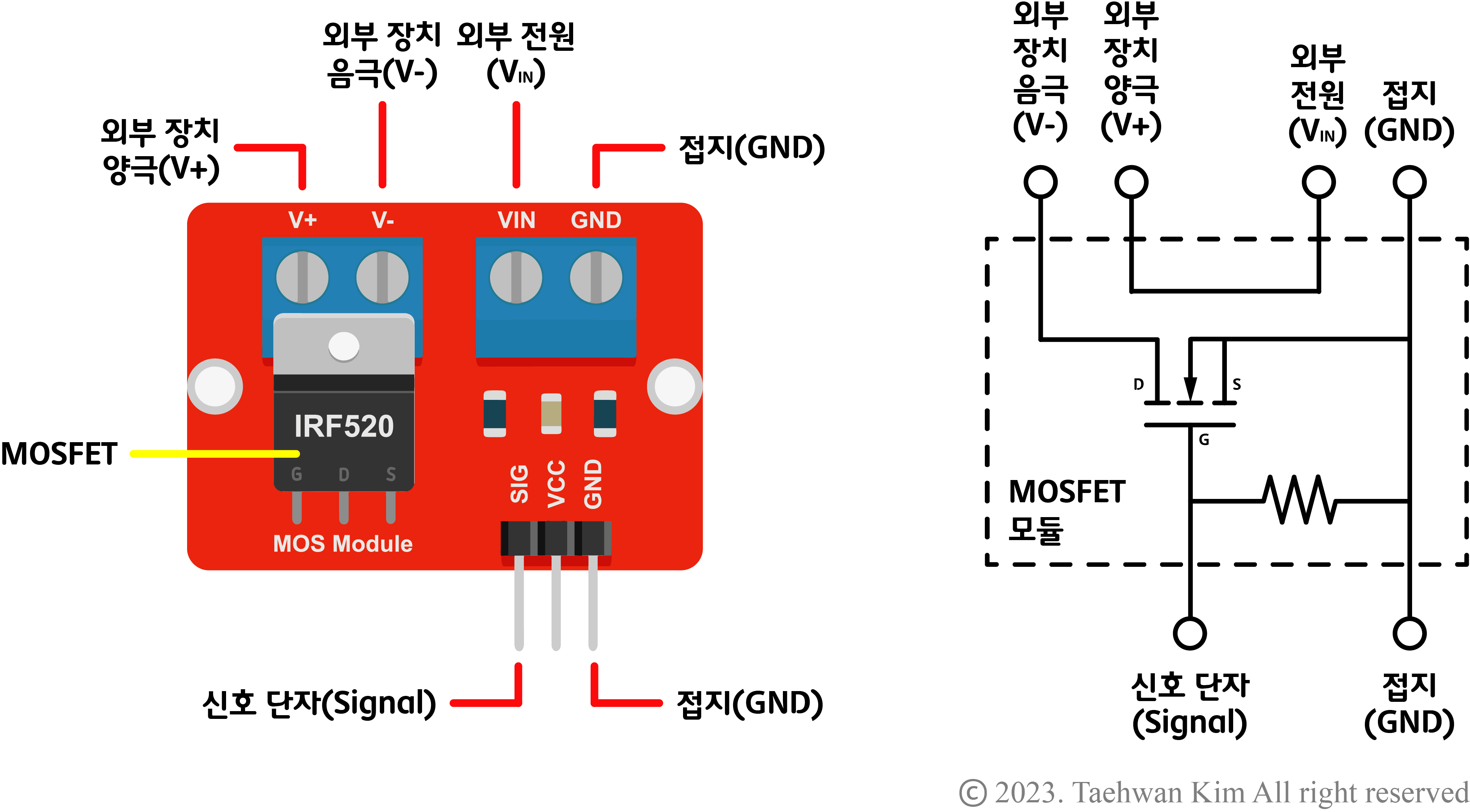 MOSFET 모듈 MOSFET(Metal Oxide Semiconductor Field Effect Transistor)은 트랜지스터의 일종으로, 전기 신호로 제어할 수 있는 전기적 스위치 소자이다. 게이트(Gate), 드레인(Drain), 소스(Source) 단자를 가지고 있으며, 게이트 단자에 전압을 가하면 드레인 단자와 소스 단자 사이에 전류가 흐를 수 있게 된다. 이를 이용해 낮은 전압의 제어 신호로 높은 전압에서 동작하는 회로를 제어할 수 있다. MOSFET을 동작하기 위한 최소 전압은 MOSFET의 모델에 따라 다른데, IRF520과 같은 MOSFEF은 아두이노 디지털 신호로도 제어가 가능하다. 특히 IRF520으로 제작된 MOSFET 모듈은 일반적인 모듈처럼 배선할 수 있어 사용하기 간편하다. IRF520을 이용한 MOSFET 모듈은 아래 링크로 접속하면 구매할 수 있다.