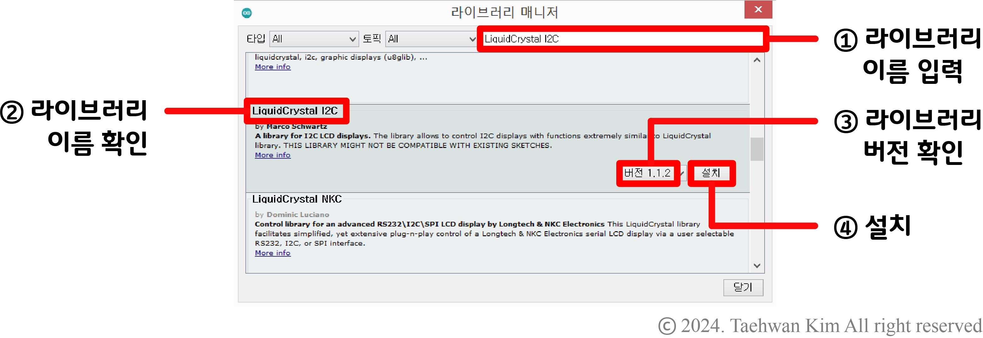 아두이노 라이브러리 LiquidCrystal I2C 설치 아두이노 플랫폼에서 I2C 통신을 이용해 LCD를 제어하더라도 사용자가 이를 직관적으로 다룰 수 있도록, LCD와 I2C 통신하는 라이브러리를 보유하고 있다. 그러나 앞서 사용해보았던 'LiquidCrystal' 라이브러리처럼 기본적으로는 제공되지 않기 때문에, 라이브러리를 IDE에 추가하는 과정이 필요하다. 아두이노 IDE 상단 툴바에서 '툴'을 선택한 뒤 '라이브러리 관리' 항목을 선택하자. 그러면 곧이어 '라이브러리 매니저' 창이 나타난다. '라이브러리 매니저' 창 오른쪽 상단에 라이브러리 이름을 입력하면 아두이노 플랫폼에서 지원하는 라이브러리를 검색할 수 있다. 해당 칸에 우리가 이번 예제에서 사용할 라이브러리 'LiquidCrystal I2C'를 입력하자. 라이브러리를 검색하면 입력한 검색어와 관련된 라이브러리 목록이 나타난다. LCD와 I2C 통신을 구현한 다양한 라이브러리가 있지만, 해당 예제에서는 Marco Schwartz의 라이브러리 'LiquidCrystal I2C' 버전 1.1.2를 설치하도록 하겠다. 아래 링크로 접속하면 해당 라이브러리에 대한 설명과 사용방법을 확인할 수 있다.