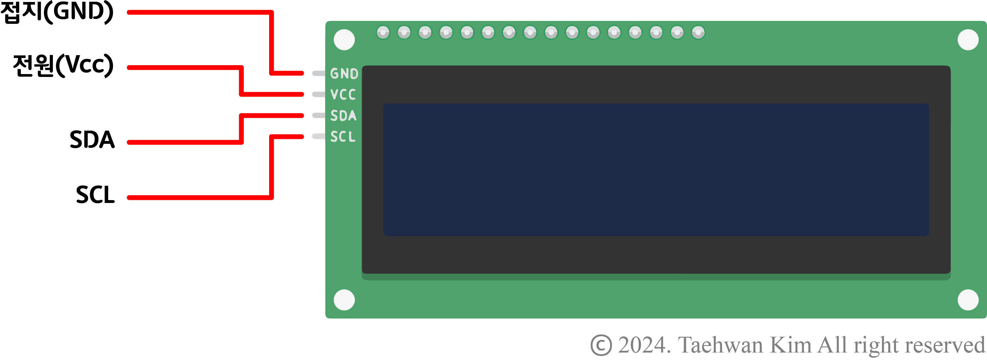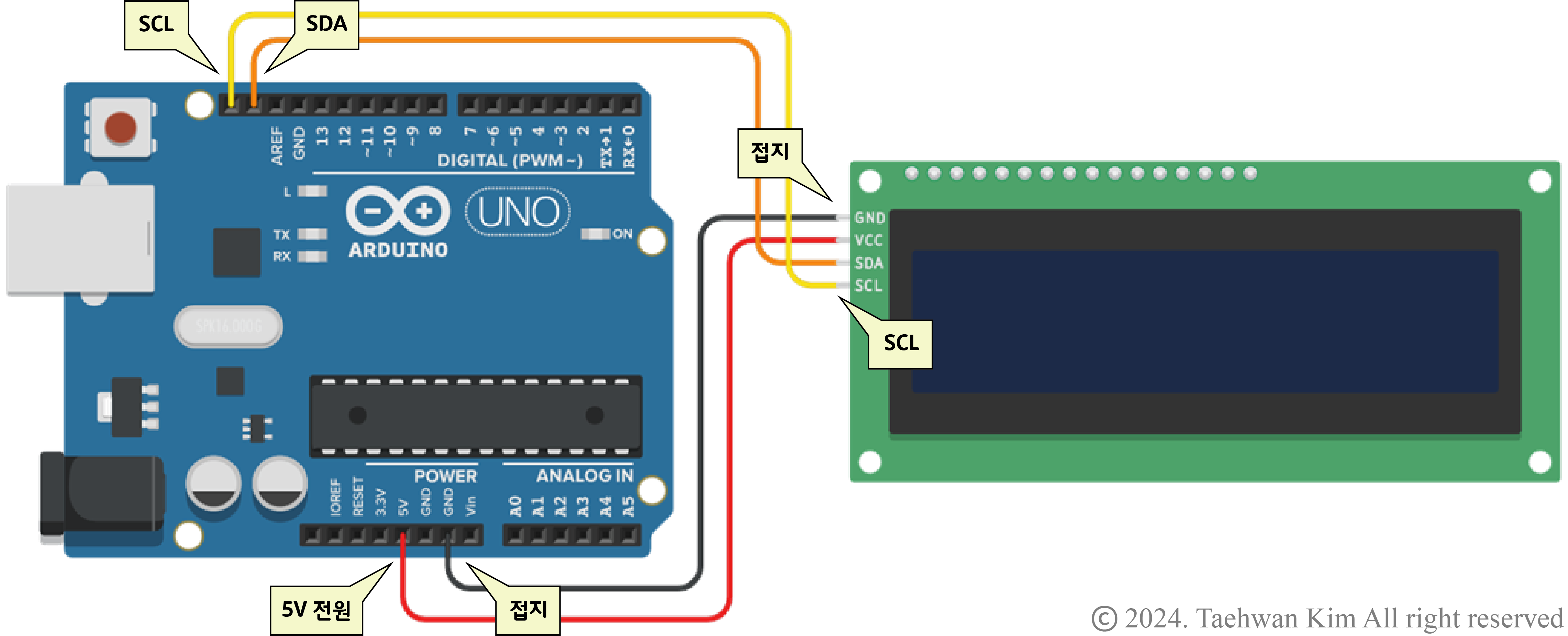 #include <Wire.h> // I2C 통신 라이브러리 추가 void setup() { Wire.begin(); // I2C 통신 시작 Serial.begin(9600); // 시리얼 통신 시작 (통신 속도: 9600 bps) while (!Serial); // 시리얼 통신이 시작될 때까지 대기 Serial.println("\nI2C Scanner"); // 시리얼 모니터에 문자열 출력 후 줄 바꿈 } void loop() { int nDevices = 0; // 정수형 변수 선언 후 0으로 초기화 Serial.println("Scanning..."); // I2C 주소 탐색 for (byte address = 1; address < 127; ++address) { Wire.beginTransmission(address); // 주소 address를 가진 장치에 전송 시작 byte error = Wire.endTransmission(); // 전송 종료 후 통신 결과를 바이트 변수에 저장 // 주변 장치를 찾아 I2C 통신에 성공했을 경우 if (error == 0) { Serial.print("I2C device found at address 0x"); if (address < 16) { Serial.print("0"); } Serial.print(address, HEX); Serial.println(" !"); ++nDevices; } // 주변 장치와의 I2C 통신에 오류가 있을 경우 else if (error == 4) { Serial.print("Unknown error at address 0x"); if (address < 16) { Serial.print("0"); } Serial.println(address, HEX); } } // I2C 통신에 성공한 주변 장치가 없을 경우 if (nDevices == 0) { Serial.println("No I2C devices found\n"); } else { Serial.println("done\n"); } delay(5000); // 5000 ms 대기 }5.3. 프로그램 작성 - LCD I2C 모듈 제어