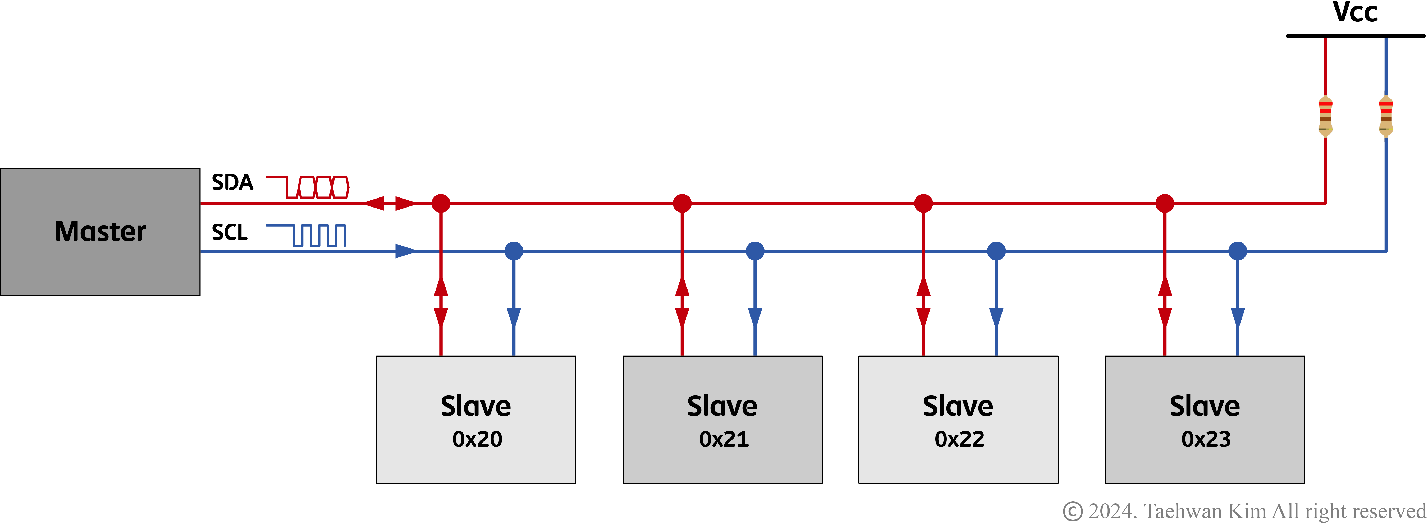 I2C 통신 두 장치가 일대일로 통신하는 시리얼 통신과는 다르게, I2C(Inter-Integrated Circuit) 통신은 한 컨트롤러(master)에 여러 개의 주변 장치(slave)를 연결하여 신호를 주고 받는다. I2C 통신은 데이터를 보내는 직렬 데이터 라인(Serial Data, SDA)과 데이터를 구분하는 직렬 클럭 라인(Serial Clock, SCL)으로 구성되어 있으며, 컨트롤러와 모든 주변 장치가 두 가닥의 신호선을 공유한다. 컨트롤러와 I2C 통신을 하는 모든 주변 장치는 자기만의 주소를 가지고 있는데, 통신할 때 해당 정보를 직렬 데이터 라인에 포함시켜 신호를 주고 받는다.
