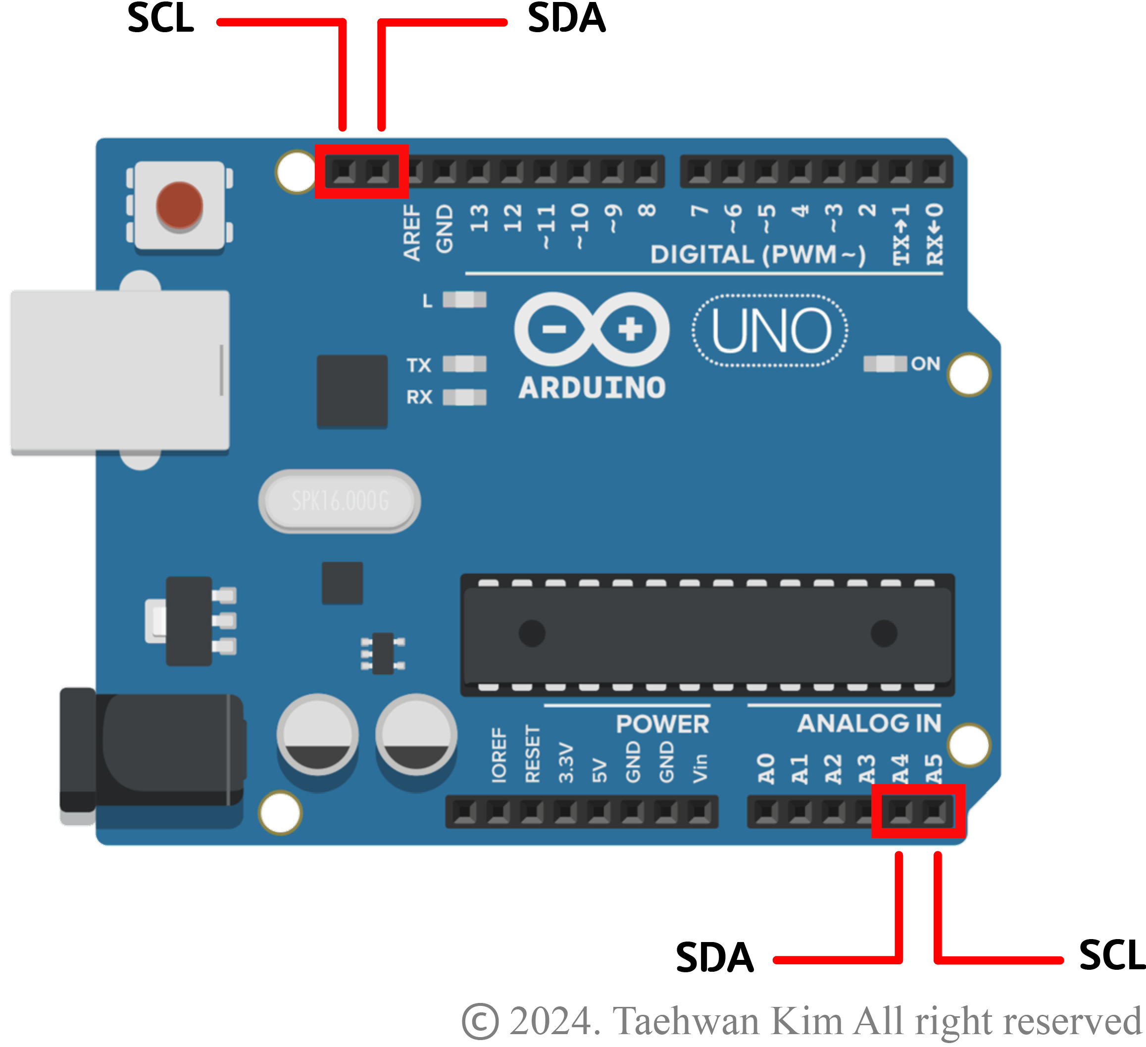 아두이노 우노 SDA핀과 SCL핀 아두이노 플랫폼에서도 I2C 통신을 지원하므로, 아두이노 하드웨어에 I2C 통신을 위한 SDA핀과 SCL핀이 기본적으로 탑재되어 있다. 그러나 아두이노 우노는 제조사에 따라 해당 핀들이 구현되어 있지 않을 수 있는데, 이때 아두이노 우노의 아날로그 입력 A4번 핀을 SDA핀으로, A5번 핀을 SCL핀으로 사용할 수 있다.
