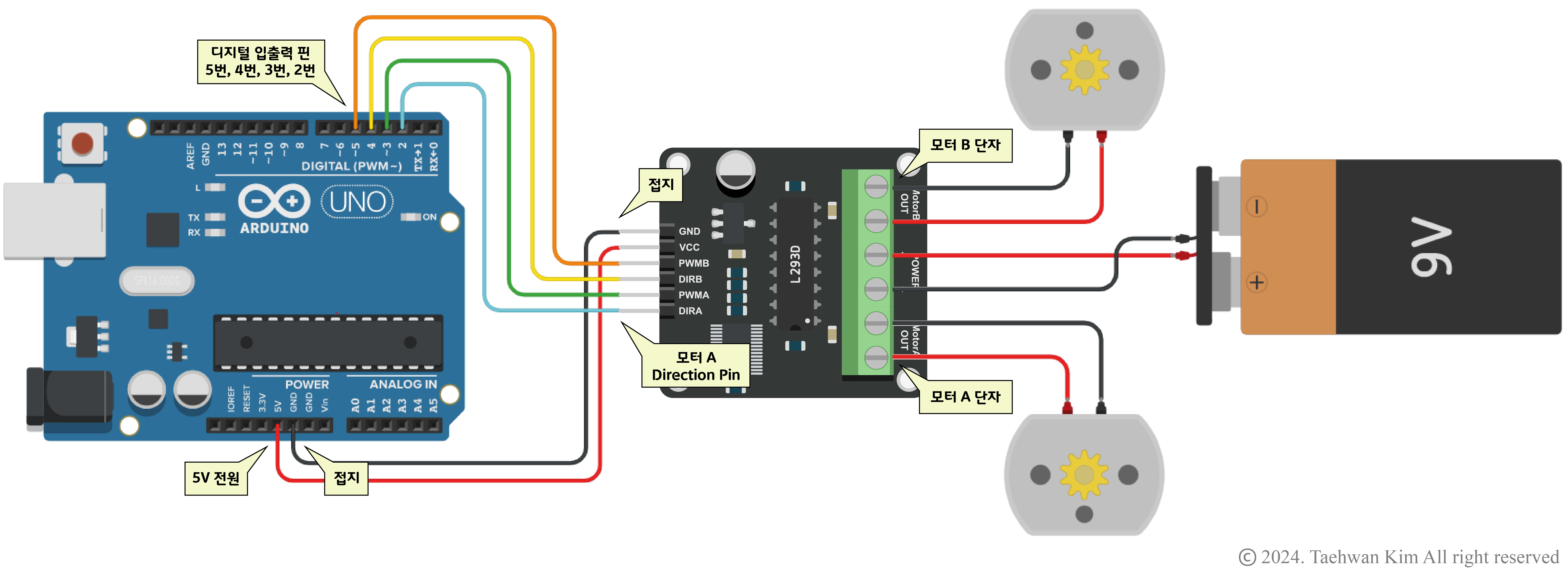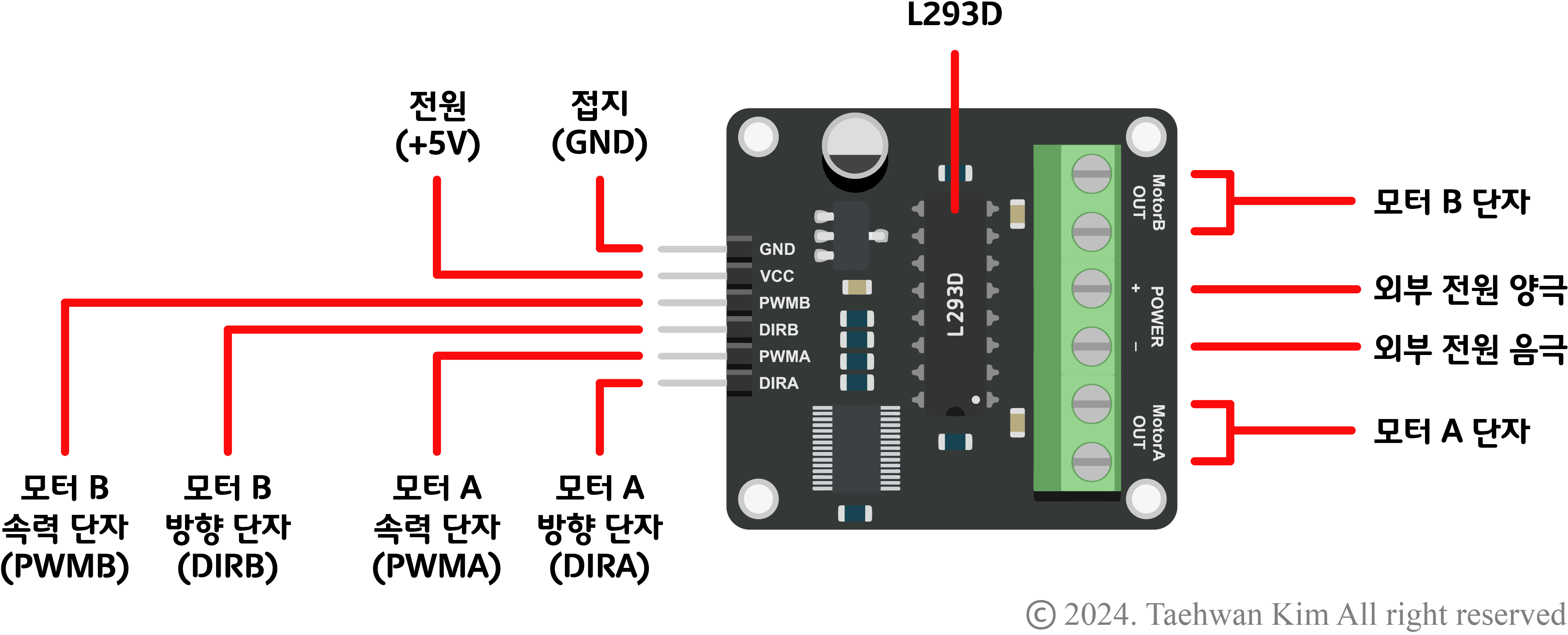 L293D DC모터 드라이버 모듈 DC모터 2개를 양방향으로 제어하기 위해 L293D와 전자 소자를 탑재한 DC모터 드라이버 모듈이다. 모터 방향 단자에 디지털 신호를 입력하거나 입력하지 않는 것으로 DC모터의 회전 방향을 제어할 수 있고, 속력 단자에 PWM 제어 신호를 입력하는 것으로 DC모터의 회전 속력을 제어할 수 있다. L293D를 단독으로 사용할 때보다 배선이 직관적이고 간단하다는 장점이 있다. L293을 이용한 DC모터 드라이버 모듈은 아래 링크로 접속하면 구매할 수 있다.