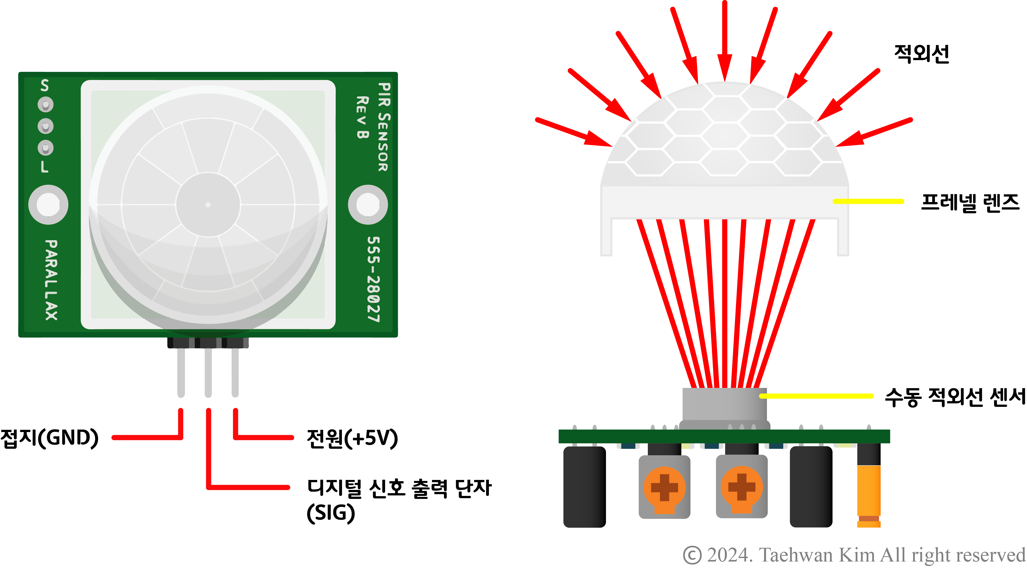 PIR센서 모듈 HC-SR501 전자기파는 파장의 길이에 따라 감마선, X-선, 자외선, 가시광선, 적외선 등으로 나눌 수 있는데, 그중 적외선(Infrared Ray, IR)은 가시광선보다 긴 파장을 가진 전자기파이다. 사람의 눈으로 볼 수 있는 가시광선보다 긴 파장을 가지고 있어 사람 눈에 보이지 않는다. 수동 적외선 센서(Passive Infrared Ray, PIR)는 외부에서 유입되는 적외선을 감지하는 센서로, 주로 사람의 몸에서 나오는 적외선을 감지하는데 사용되기 때문에 인체 감지 센서라고도 불린다. 모듈 HC-SR501의 경우, 외부에서 유입되는 적외선을 센서로 모으는 프레넬 렌즈와 3개의 단자를 가지고 있으며, 외부 적외선의 변화를 감지하여 변화 여부를 디지털 신호로 출력한다. PIR센서 모듈 HC-SR501은 아래 링크로 접속하면 구매할 수 있다.