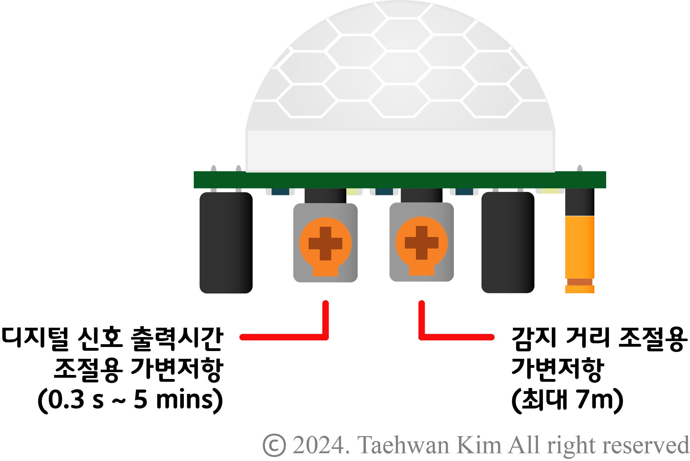 HC-SR501 성능 조절 방법 PIR센서 모듈 HC-SR501은 센서의 성능을 조절할 수 있는 두 개의 가변저항을 가지고 있다. 위 그림 기준으로 왼쪽에 있는 가변저항을 조절하면, 외부 적외선의 변화가 감지되었을 때 디지털 신호가 출력되는 시간을 조절할 수 있다. 만약 모듈로부터 출력되는 시간이 너무 짧거나 길다면 해당 가변저항을 조절해보자. 오른쪽에 있는 가변저항을 조절하면, 외부 적외선을 변화를 감지하는 거리를 조절할 수 있다. 만약 모듈의 작동 거리가 충분한 것 같지 않다면 해당 가변저항을 조절해보자.