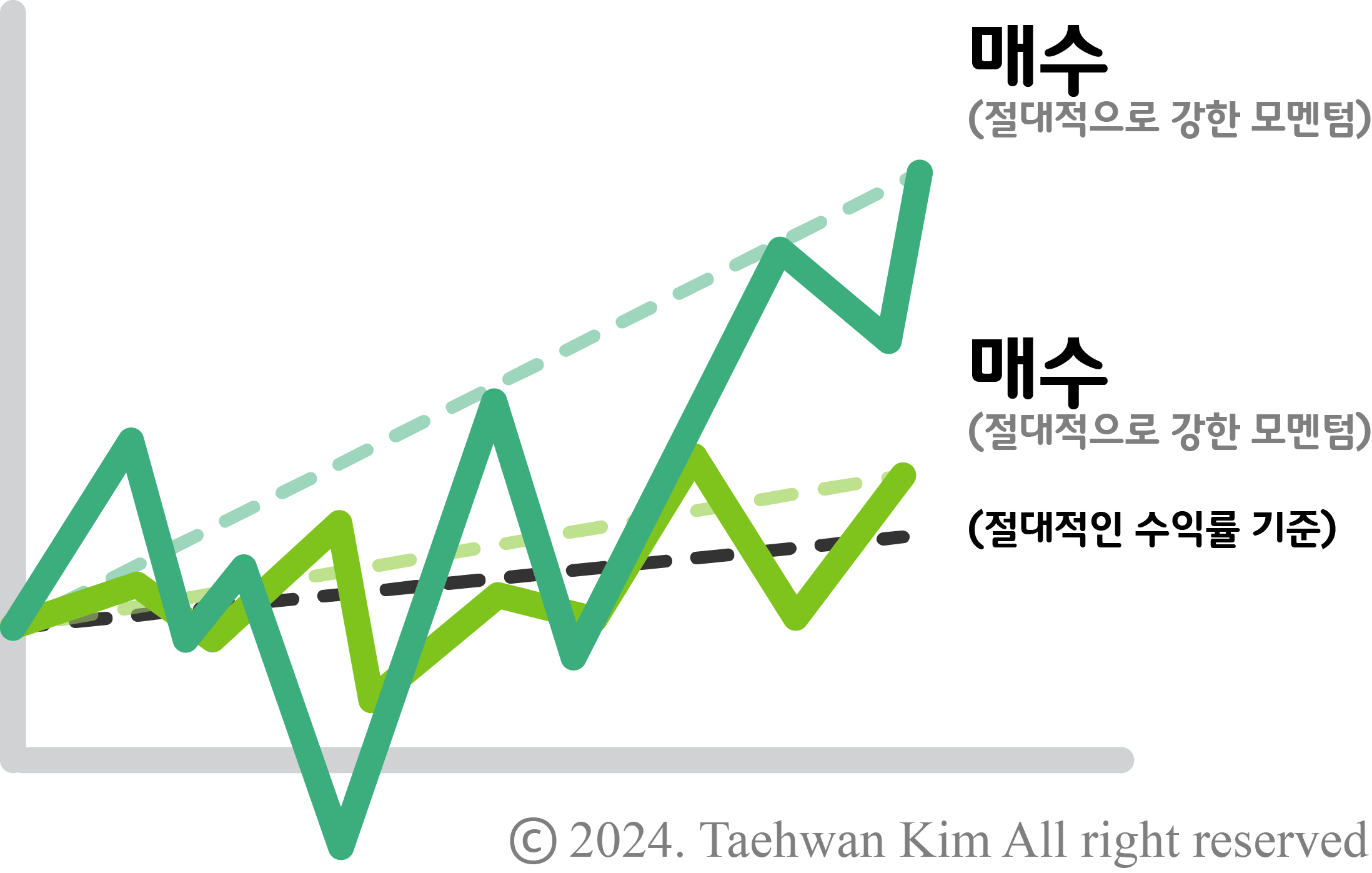 절대 모멘텀 절대 모멘텀(absolute momentum)은 다른 주식의 수익률과는 독립적으로 각 주식 자체의 과거 수익률만을 기반으로 계산하며, 시계열 모멘텀(time-series momentum)이라고도 불린다. 절대 모멘텀 규칙에 따라 종목을 매수한다면, 지난 12개월 동안의 실적이 채권보다 높은 종목은 매수하고, 낮은 종목은 매도한다. 예를 들어, 채권의 12개월 수익률이 100%라면, 해당 수익률을 절대적인 기준으로 종목을 매수하면 된다. 종목 A와 종목 B 모두 12개월 전 주가가 25달러였고, 오늘자 종목 A의 주가는 55달러, 종목 B의 주가는 60달러라면, 각 종목의 수익률은 120%, 140%이므로 두 종목 모두 매수하면 된다. 절대 모멘텀은 상대 모멘텀과 달리 포트폴리오의 위험도를 줄일 수 있다.