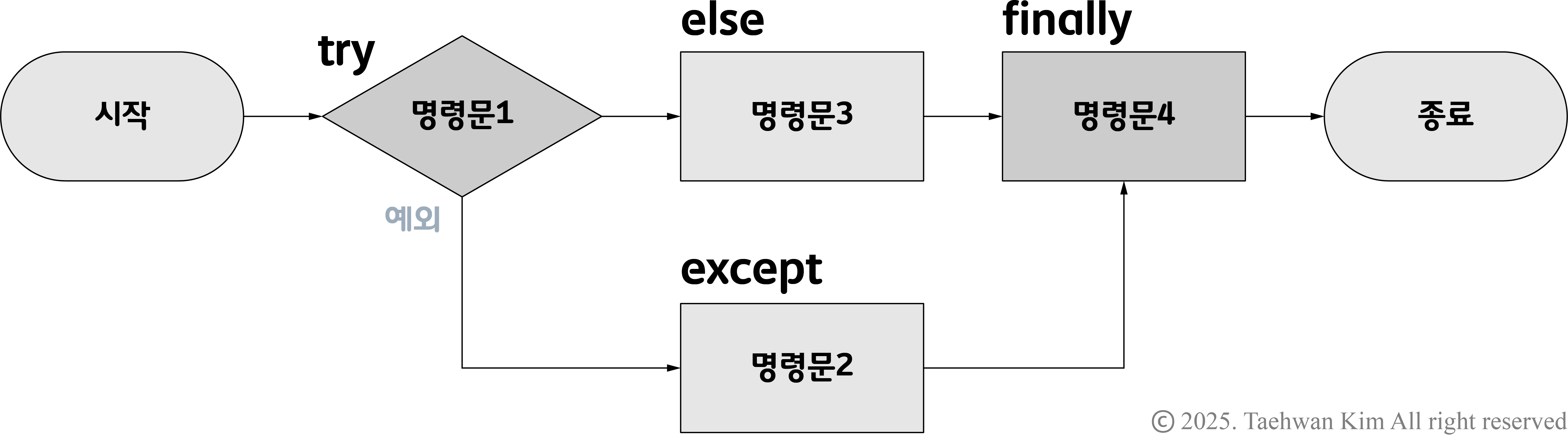 try: # 명령문1 number1 = int(input('분자에 해당하는 정수값을 입력하세요: ')) number2 = int(input('분모에 해당하는 정수값을 입력하세요: ')) number3 = number1 / number2 except: # 명령문2 print('[경고] 입력한 값을 확인하세요.') else: # 명령문3 print(f'{number1}(을/를) {number2}(으)로 나눈 결과는 {number3}입니다.') finally: # 명령문4 print('프로그램을 종료합니다.')try 명령문 쌍점 아래로 들여쓰기 하여 예외가 발생할 가능성이 있는 명령문을 작성한다. try 명령문에 속한 명령문을 실행하는 도중에 예외가 발생하면 곧바로 except 명령문 아래로 들여쓰기가 되어 있는 명령문이 실행되고, 마지막으로 finally 명령문에 속한 명령문이 실행된다. 반면에 try 명령문에 속한 명령문을 실행했을 때 예외가 발생하지 않는다면, else 명령문과 finally 명령문에 속한 명령문이 차례대로 실행된다. 예외 처리에서 try 명령문과 except 명령문은 반드시 있어야 하며, else 명령문과 finally 명령문은 선택 사항이므로 생략할 수 있다.