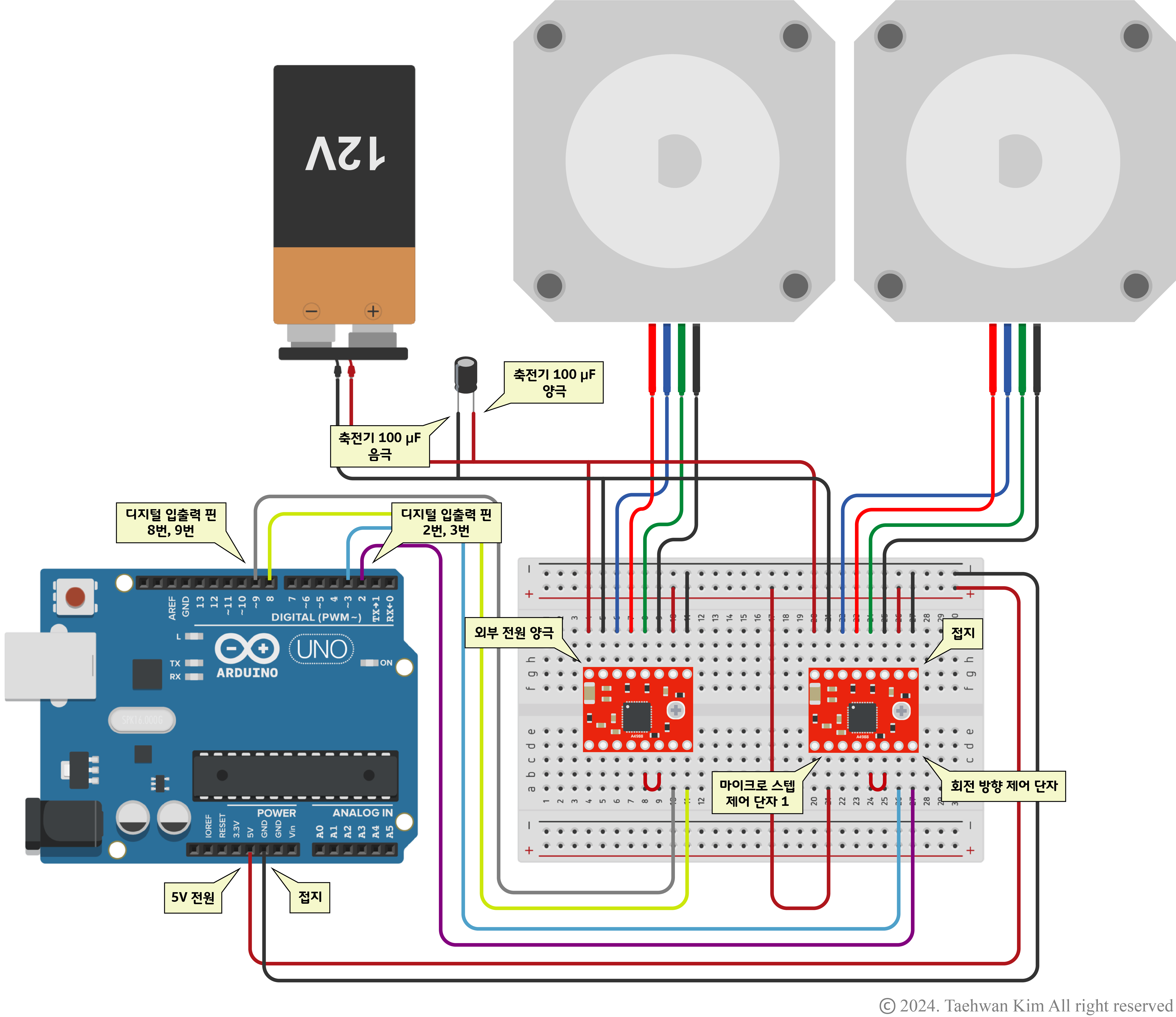 #include <AccelStepper.h> // 스텝모터 가속 제어를 위한 라이브러리 추가 int FULLSTEP = 4; // 라이브러리 풀 스텝 설정 계수 정의 int HALFSTEP = 8; // 라이브러리 하프 스텝 설정 계수 정의 int steps_per_rev = 2048; // 스텝모터 회전 단계 수 정의 // 스텝모터 객체 생성 // 마이크로 스테핑 모드 설정 // 모듈과 연결된 디지털 핀을 IN1-IN3-IN2-IN4 순서로 정의 AccelStepper myStepper1(FULLSTEP, 8, 10, 9, 11); AccelStepper myStepper2(HALFSTEP, 4, 6, 5, 7); void setup() { myStepper1.setMaxSpeed(1000); // myStepper1의 회전 속력 한도를 1000 step/s으로 설정 myStepper1.setAcceleration(50); // myStepper1의 회전 가속력을 50 step/s^2으로 설정 myStepper1.setSpeed(200); // myStepper1의 회전 속력을 200 step/s으로 설정 myStepper1.moveTo(steps_per_rev); // myStepper1의 목표 단계를 2048단계로 설정 myStepper2.setMaxSpeed(1000); myStepper2.setAcceleration(50); myStepper2.setSpeed(200); myStepper2.moveTo(-steps_per_rev); // myStepper1의 목표 단계를 -2048단계로 설정 } void loop() { if (myStepper1.distanceToGo() == 0) // myStepper1이 목표 단계까지 동작해야할 단계가 0과 같을 경우 { myStepper1.moveTo(-myStepper1.currentPosition()); // myStepper1의 목표 단계를 반대로 설정 if (myStepper2.distanceToGo() == 0) { myStepper2.moveTo(-myStepper2.currentPosition()); } } myStepper1.run(); // 사전에 설정한 대로 myStepper1 동작 시작 myStepper2.run(); }3.3. 회로 구성 - 바이폴라 스텝모터 드라이버 A4988 모듈