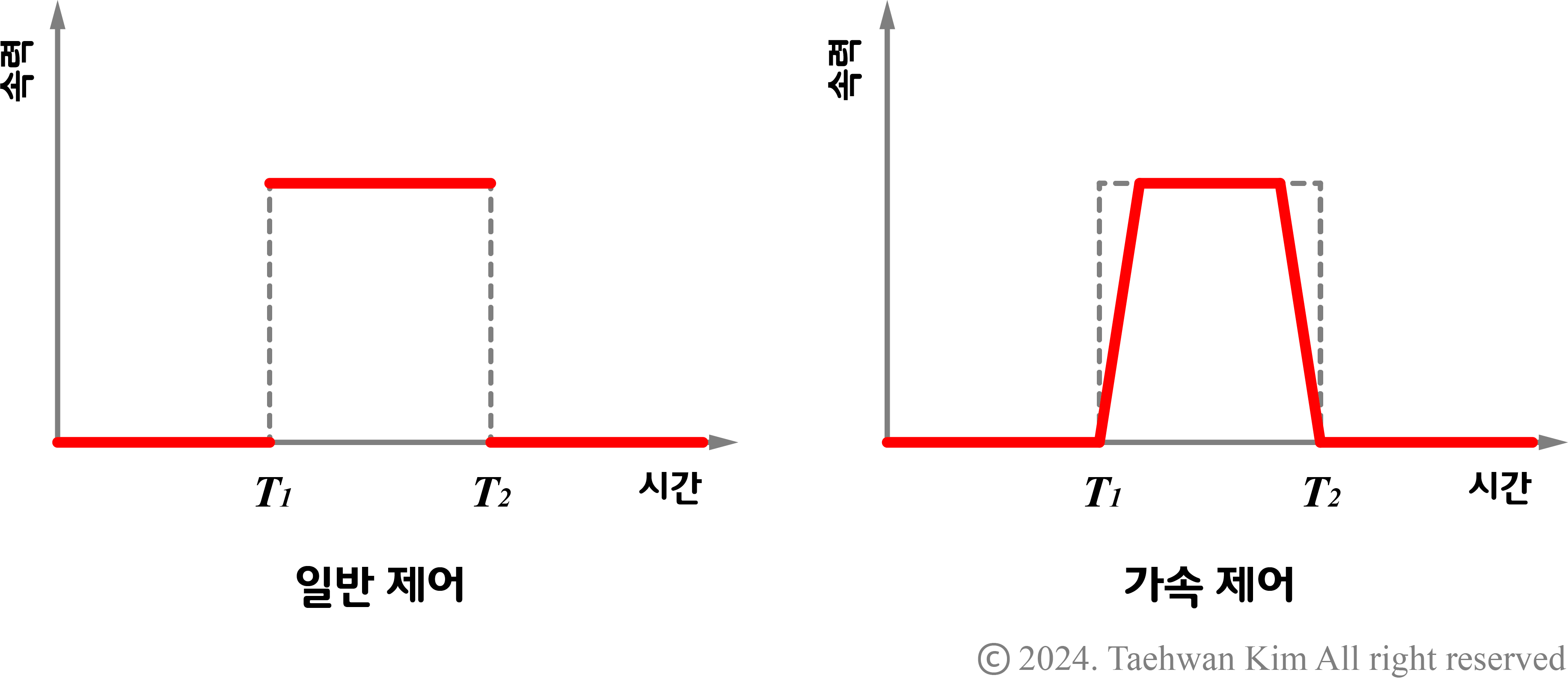 스텝모터 가속 제어 앞서 소개한 방법으로 스텝모터를 제어했다면 스텝모터의 동작이 부드럽지 않았을 것이다. 이는 위 그림의 왼쪽 그래프처럼 스텝모터의 회전을 갑자기 변속했기 때문이다. 부드러운 동작을 원한다면 위 그림의 오른쪽 그래프처럼 일정한 시간동안 스텝모터의 회전 속력을 연속적으로 변경해야 한다. 이러한 가속 제어는 유니폴라 스텝모터 드라이버의 경우 반복문을 사용하여 한 단계 동작할 때마다 회전 속력을 서서히 변경하는 것으로, 바이폴라 스텝모터 드라이버의 경우 반복문을 사용하여 단계 제어 단자에 입력하는 펄스 주기를 서서히 변경하는 것으로 직접 구현할 수 있다.