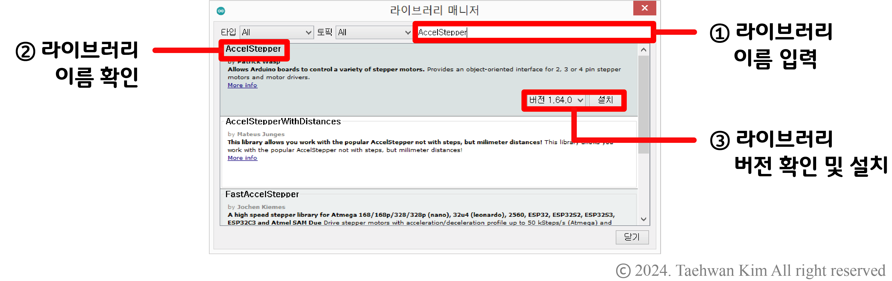 아두이노 라이브러리 추가 아두이노 플랫폼에는 스텝모터의 가속 제어를 위한 알고리즘이 라이브러리로 구현되어 있다. 그러나 기본적으로 제공되는 라이브러리는 아니기 때문에 라이브러리를 IDE에 추가하는 과정이 필요하다. 아두이노 IDE 상단 툴바에서 '툴'을 선택한 뒤 '라이브러리 관리' 항목을 선택하자. 그러면 곧이어 '라이브러리 매니저' 창이 나타나는데, 해당 창 오른쪽 상단에 라이브러리 이름을 입력하면 아두이노 플랫폼에서 지원하는 라이브러리를 검색할 수 있다. 해당 칸에 'AccelStepper'를 입력하자. 라이브러리를 검색하면 입력한 검색어와 관련된 라이브러리 목록이 나타난다. 'AccelStepper' 최신 버전을 선택하여 설치하도록 하자. 아래 링크로 접속하면 해당 라이브러리에 대한 설명과 사용 방법을 확인할 수 있다.