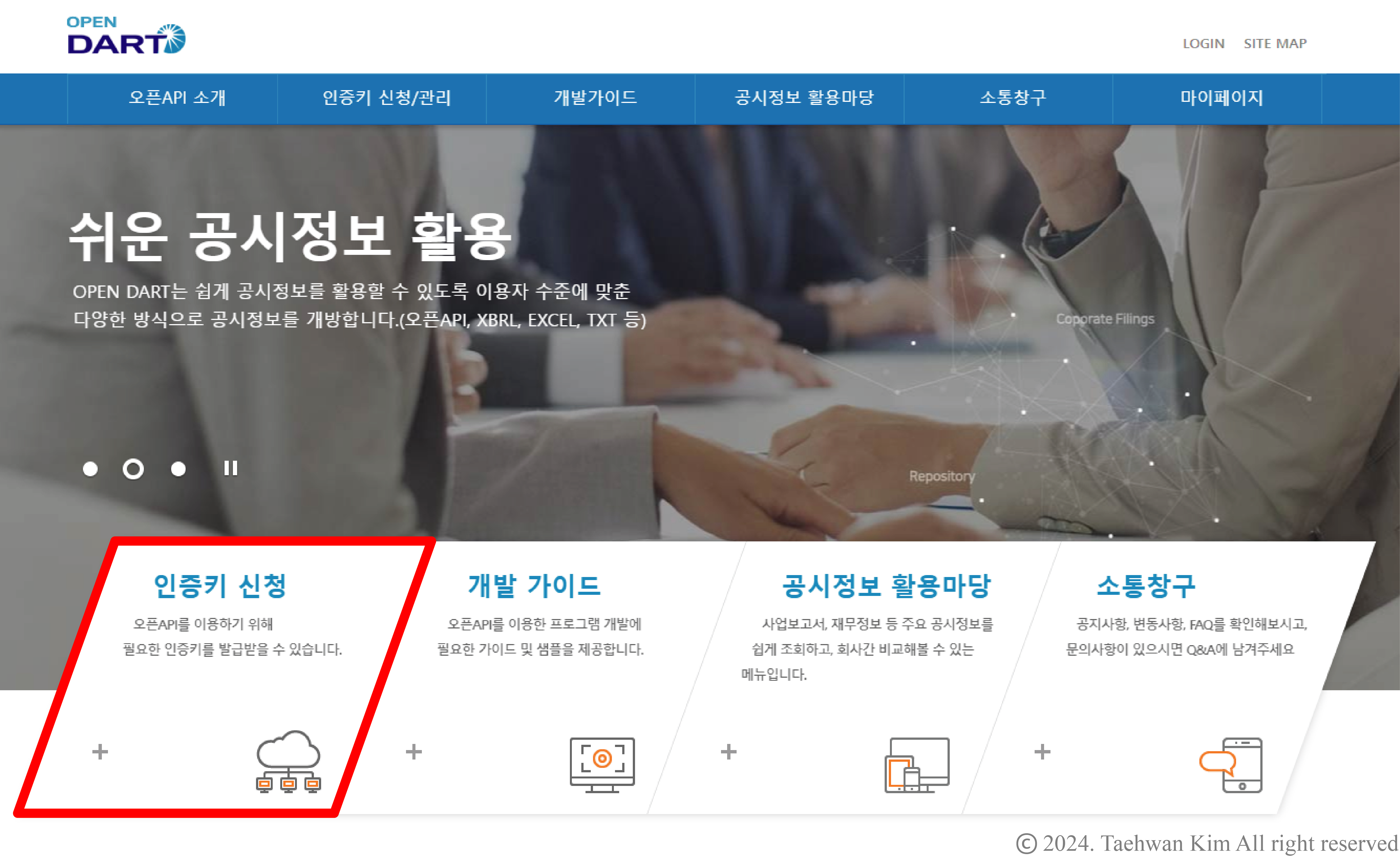 OpenDART 인증키 신청 OpenDART의 API를 이용하기 위해서는 먼저 OpenDART에 사용자 등록을 하고 인증키를 발급받아야 한다. OpenDART 홈페이지에 접속한 뒤 화면 중앙에 있는 '인증키 신청'을 클릭하자.