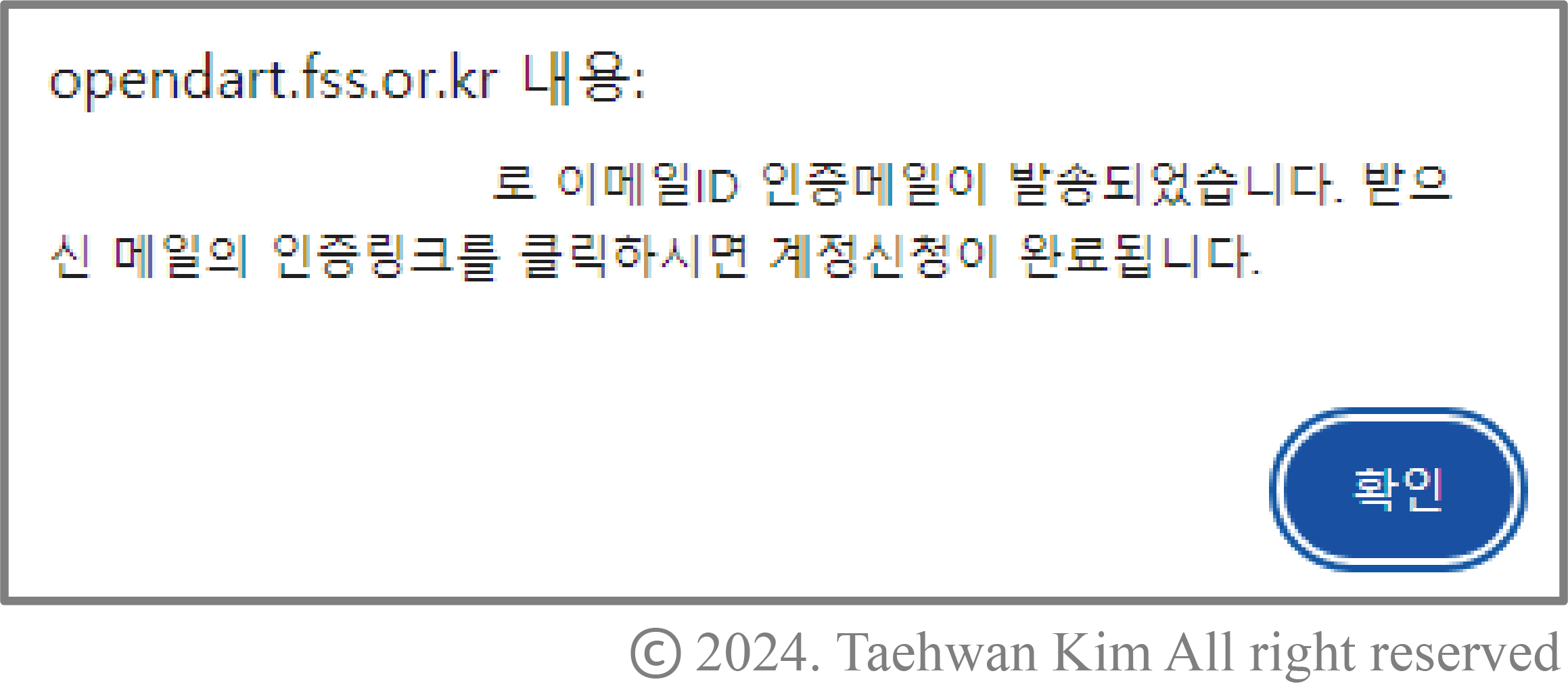 생성 계정 인증메일 확인 계정 생성을 신청하면 위와 같은 안내창이 나타난다. 안내창의 안내에 따라, 아이디로 입력한 이메일에 접속하여 금융감독원에서 발송한 인증메일을 확인하자. 메일의 인증링크를 클릭하면 계정 생성이 완료된다.