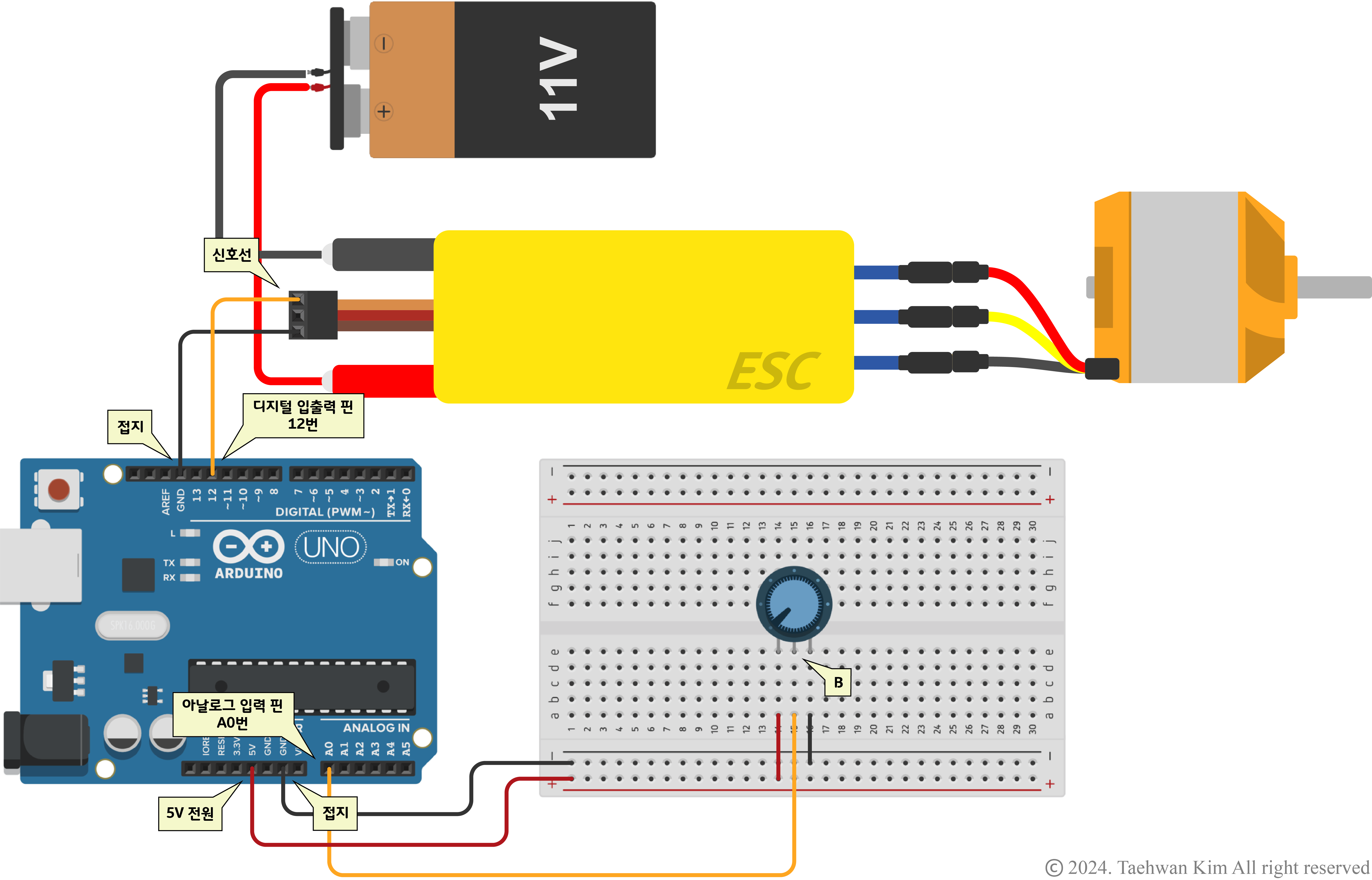 #include <Servo.h> // 서보모터 라이브러리 추가 Servo ESC; // ESC라는 이름의 서보모터 객체 생성 int value; // 정수형 변수 선언 void setup() { pinMode(A0, INPUT); // 아날로그 입력 A0번 핀을 입력(INPUT) 모드로 설정 ESC.attach(12); // ESC를 제어할 핀으로 12번 핀을 설정 Serial.begin(9600); // 시리얼 통신 시작 (통신 속도: 9600 bps) } void loop() { // 아날로그 입력 A0번 핀으로부터 아날로그 신호를 입력 받은 후 변수에 저장 value = analogRead(A0); value = map(value, 0, 1023, 1000, 2000); // 아날로그 신호 변환 후 변수에 저장 Serial.println(value); // 시리얼 모니터에 변수에 저장된 값 출력 후 줄 바꿈 ESC.writeMicroseconds(value); // ESC에 PWM 신호 출력 }5.3. 회로 구성 - 가변저항 제외