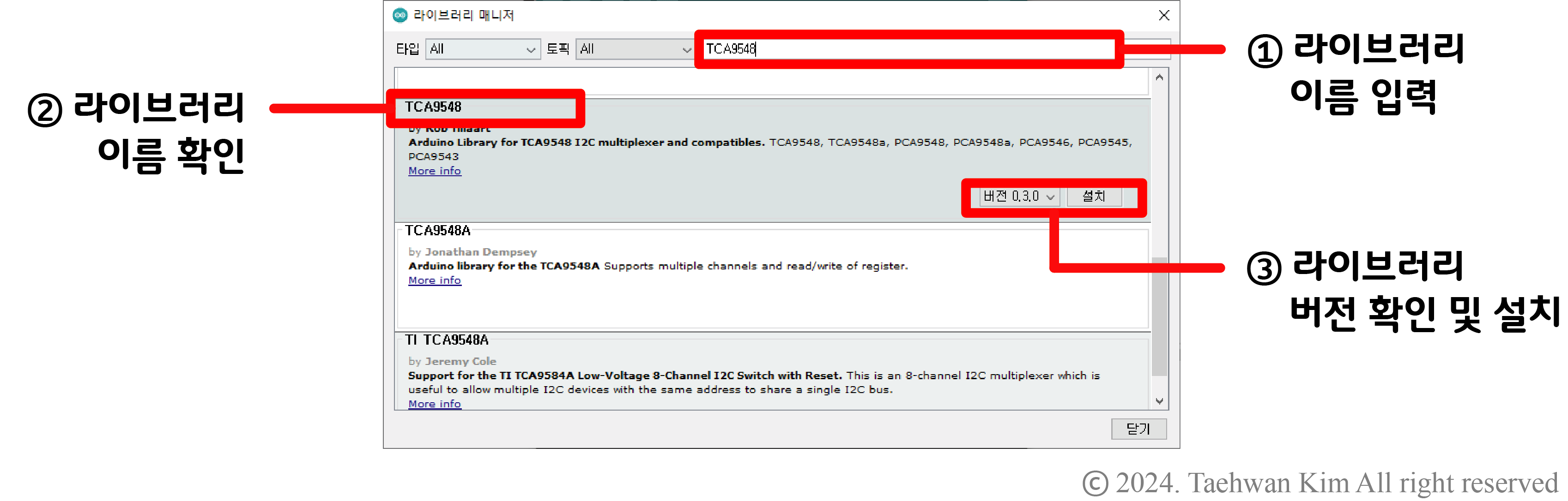 아두이노 라이브러리 추가 아두이노 플랫폼에는 TCA9548A 모듈과 I2C 통신을 하기 위한 알고리즘이 라이브러리로 구현되어 있다. 그러나 기본적으로 제공되는 라이브러리는 아니기 때문에 라이브러리를 IDE에 추가하는 과정이 필요하다. 아두이노 IDE 상단 툴바에서 '툴'을 선택한 뒤 '라이브러리 관리' 항목을 선택하자. 그러면 곧이어 '라이브러리 매니저' 창이 나타나는데, 해당 창 오른쪽 상단에 라이브러리 이름을 입력하면 아두이노 플랫폼에서 지원하는 라이브러리를 검색할 수 있다. 해당 칸에 'TCA9548'을 입력하자. 라이브러리를 검색하면 입력한 검색어와 관련된 라이브러리 목록이 나타난다. 'TCA9548' 최신 버전을 선택하여 설치하도록 하자. 아래 링크로 접속하면 해당 라이브러리에 대한 설명과 사용방법을 확인할 수 있다.