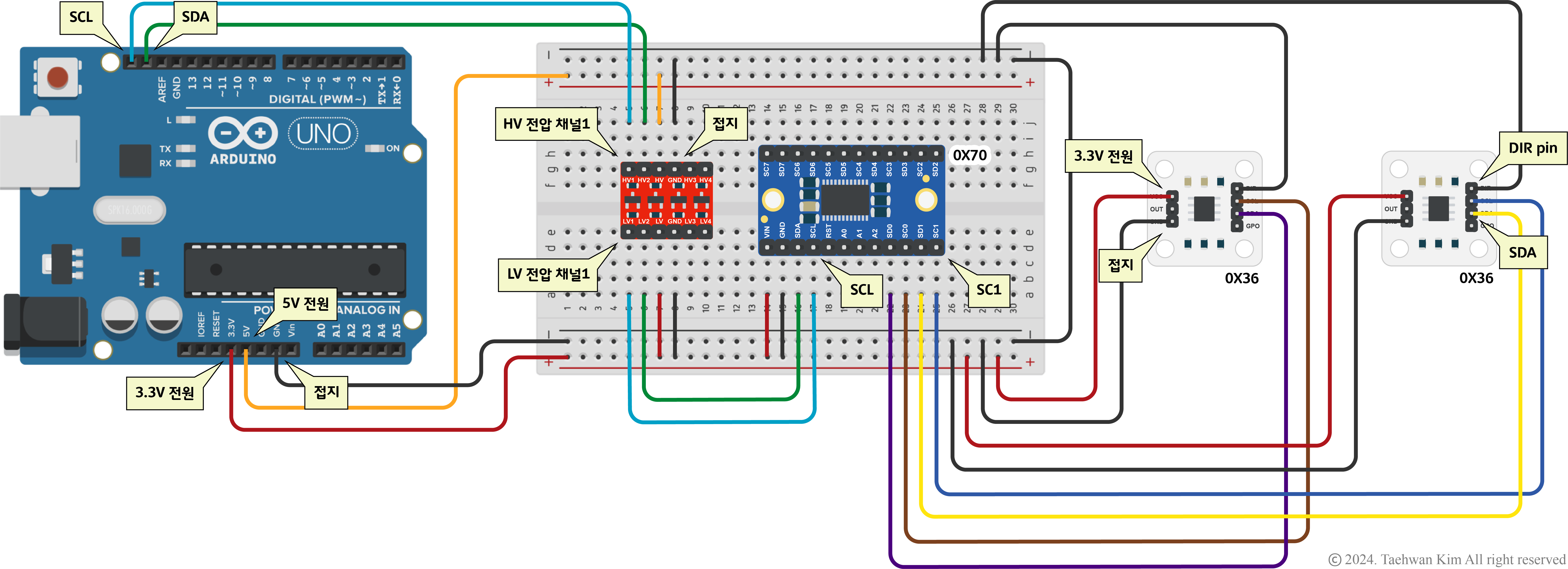 I2C 멀티플렉서 TCA9548A 모듈 I2C 통신을 지원하는 센서 모듈은 고유 주소를 가지고 있으며, 일부 모듈은 하드웨어를 수정하거나 소프트웨어로 레지스트리를 변경하여 본인의 주소를 변경할 수 있다. 하지만 앞서 다룬 AS5600 모듈과 같이 I2C 주소를 변경하는 기능을 지원하지 않는 센서를 여러 개 사용한다면 I2C 주소가 충돌하므로 문제가 발생한다. 이때 I2C 멀티플렉서 TCA9548A 모듈을 사용한다면 I2C 주소가 동일한 센서를 동시에 사용할 수 있다. TCA9548A 모듈은 총 여덟 개의 I2C 채널(SD0~SD7, SC0~SC7)을 지원하며, I2C 통신(SDA, SCK)을 매개로 마이크로프로세서와 다른 센서들을 연결한다. 아래 링크로 접속하면 해당 모듈을 구매할 수 있다.