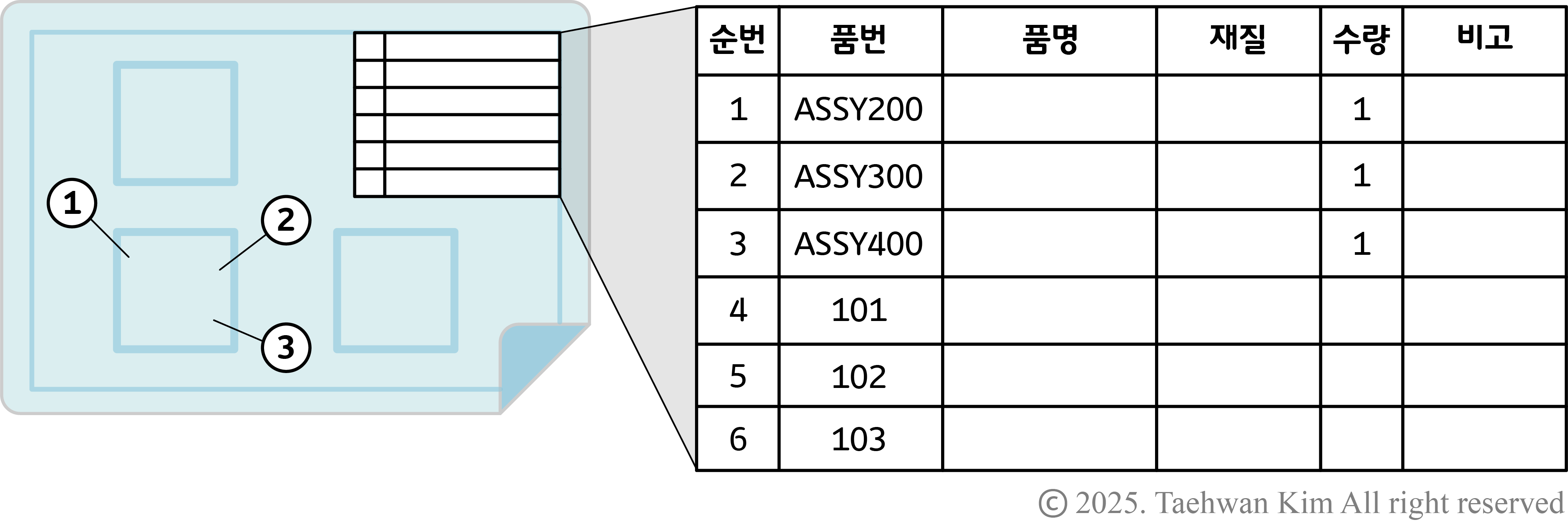 조립도와 소요부품명세서 조립도는 한 구성품에 대해서 부품들이 어떻게 조립되어 있는지 나타낸 도면이다. 정면도, 평면도, 우측면도로 구성품의 형상을 나타내고, 전체 크기 등 주요한 치수 위주로 기입한다. 필요에 따라서는 구성품의 내부 구조를 보여주기 위한 단면도 또한 추가한다. 조립도의 우측 상단에는 소요부품명세서를 표로 작성한다. 소요부품명세서의 순번은 각 구성품 혹은 부속품에 할당된 번호이며, 주요한 부품 위주로 조립도에서 지시선을 끌어내어 번호를 표시한다. 품번과 품명에는 설계 공동체 내에서 통용되는 고유번호와 이름을 각각 기입하고, 재질에는 가공품일 경우에는 원소재 재질을, 규격품일 경우에는 발주사에서 사용하는 모델명을 기입한다. 수량에는 해당 구성품을 조립하는 데 필요한 수량을 기입하고, 비고에는 발주사 이름이나 기타 유의사항을 기입한다.