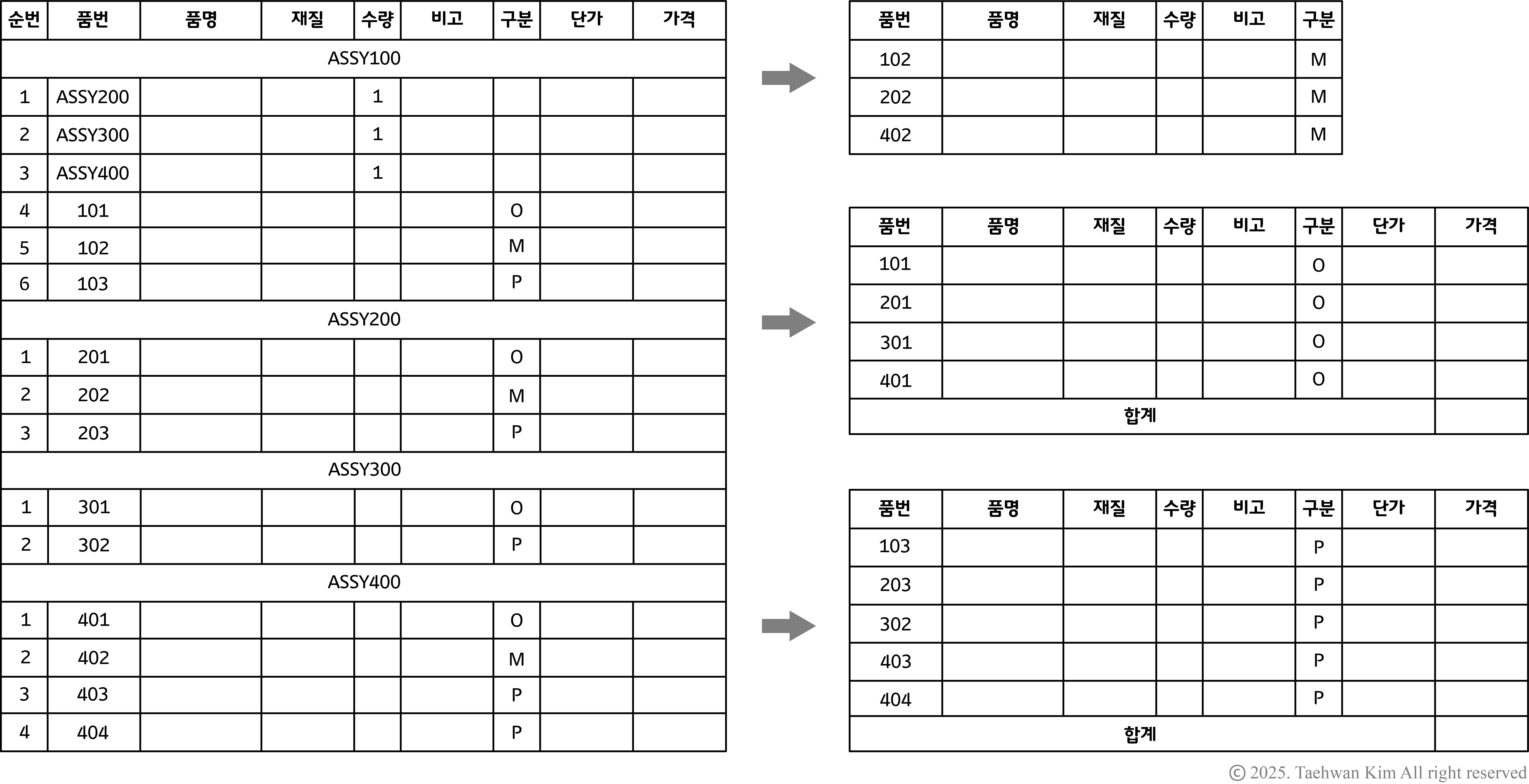 자재소요서 제작도면이 완성되면 각 조립도에 있는 소요부품명세서를 종합하여 자재소요서(Bill of Material, BOM)를 작성한다. 각 부품별로 사내품(M), 외주품(O), 구매품(P) 등으로 구분하여 조달처를 확정하고 자재소요서에 기입한다. 그리고 구분별로 자재소요서를 추가로 작성하여 관리한다. 사내품이나 외주품 제작을 위해 원자재가 필요하다면 원자재소요서 또한 작성하여 관리한다.