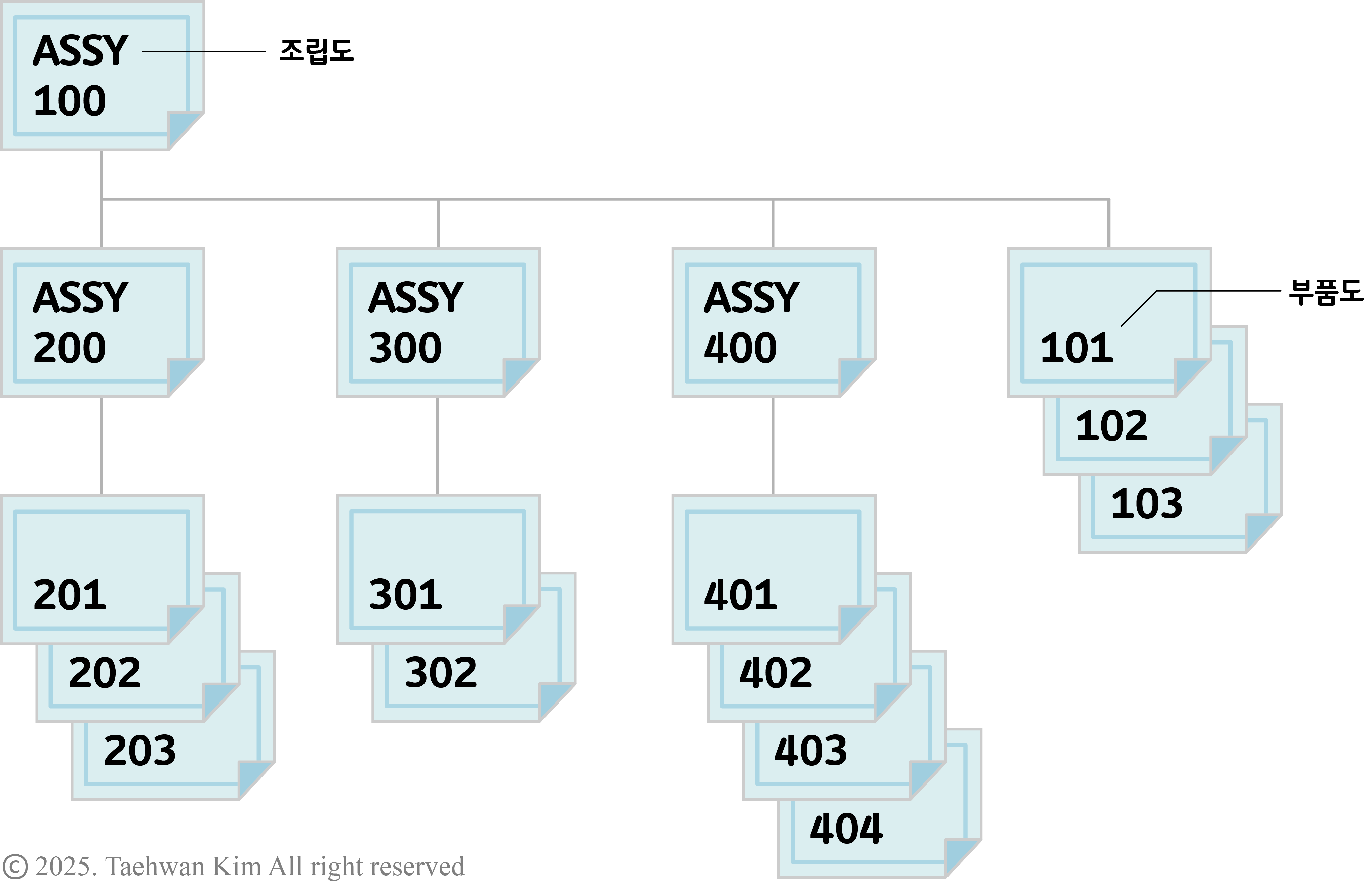 제작도면 계층 구조 최종 시제품 레이아웃의 조립도와 부품도를 작성한다. 이때 위 그림과 같이 계층 구조를 형성하여 도면을 관리한다. 시스템의 최종 조립도가 계층 구조에서 최상위에 위치하며 도번은 100으로 정의한다. 해당 도면이 조립도라는 것을 나타내기 위해 도명에 ASSY 키워드를 추가한다. 하위 계층에는 상위 조립도를 조립하기 위해 필요한 구성품의 조립도와, 동일한 계층에 속한 조립도에 포함되지 않는 부품들의 부품도가 위치한다. 각 조립도의 도번은 200, 300 등으로 새롭게 정의하고, 각 부품도의 도번은 101, 102 등으로 정의하여 100번 조립도에 소속되어 있다는 의미를 나타낸다. 나머지 조립도 또한 동일한 방식으로 계층을 나누어 도면을 관리한다.